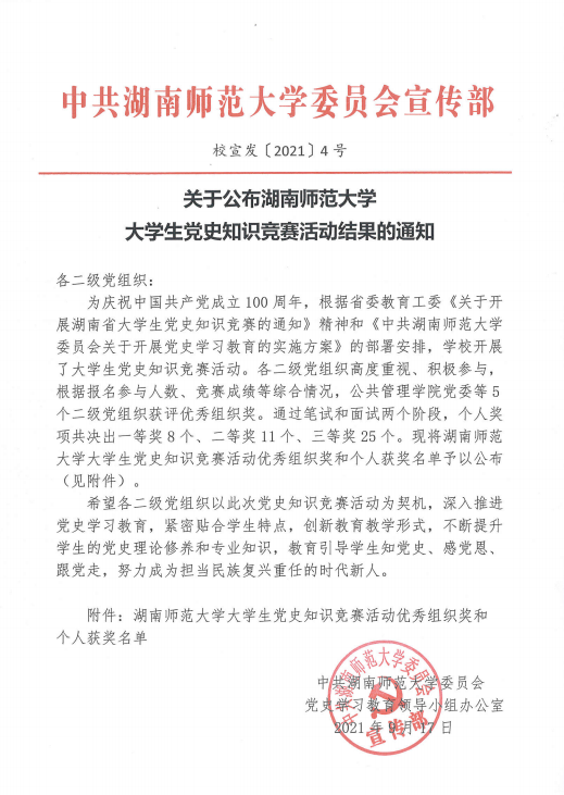 为庆祝中国共产党成立100周年,根据省委教育工委《关于开展湖南省大学生党史知识党赛的通知》精神和《中共英国365集团委员会关于开展党史学习教育的实施方案》的部署安排,学校开展了大学生党史知识竞赛活动。根据报名参与人数、竞赛成绩等综合情况,公共管理学院党委等5个二级党组织获评优秀组织奖。通过笔试和面试两个阶股,个人奖项共决出一等奖8个、二等奖11个、三等奖25个。我院党委荣获优秀组织奖。
