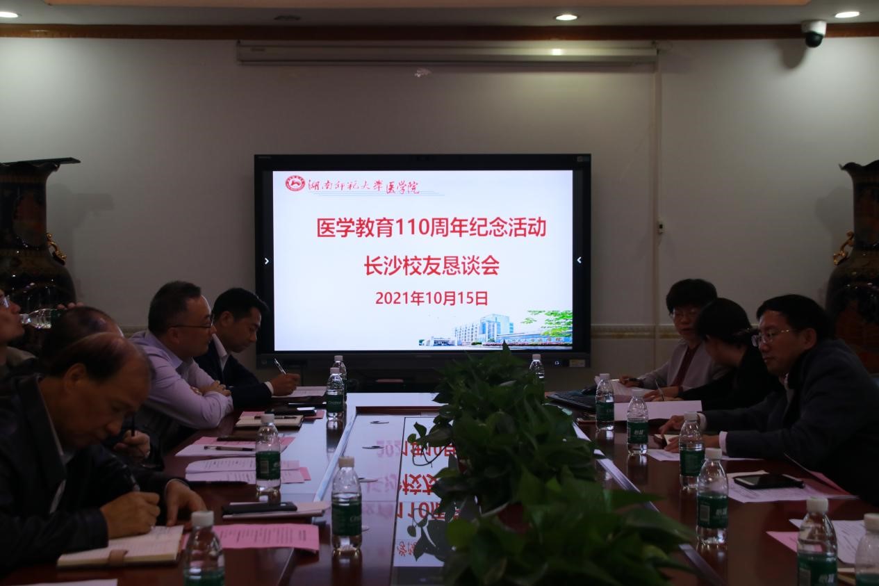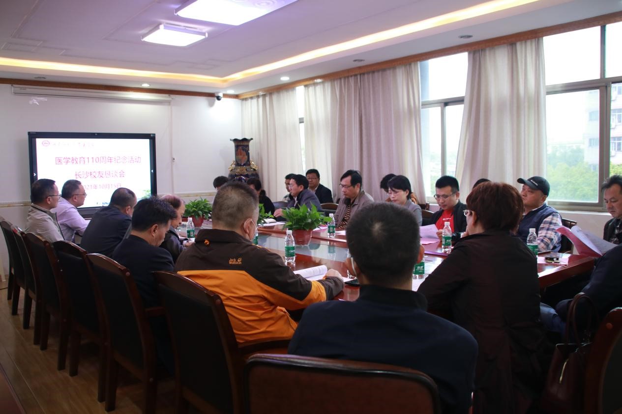10月15日下午,在医学校友会长沙分会的倡议下,20余名校友代表应邀参加医学教育110周年纪念活动长沙校友恳谈会,我院全体班子成员及学工办辅导员参加会议。会议由院长何祖平主持。