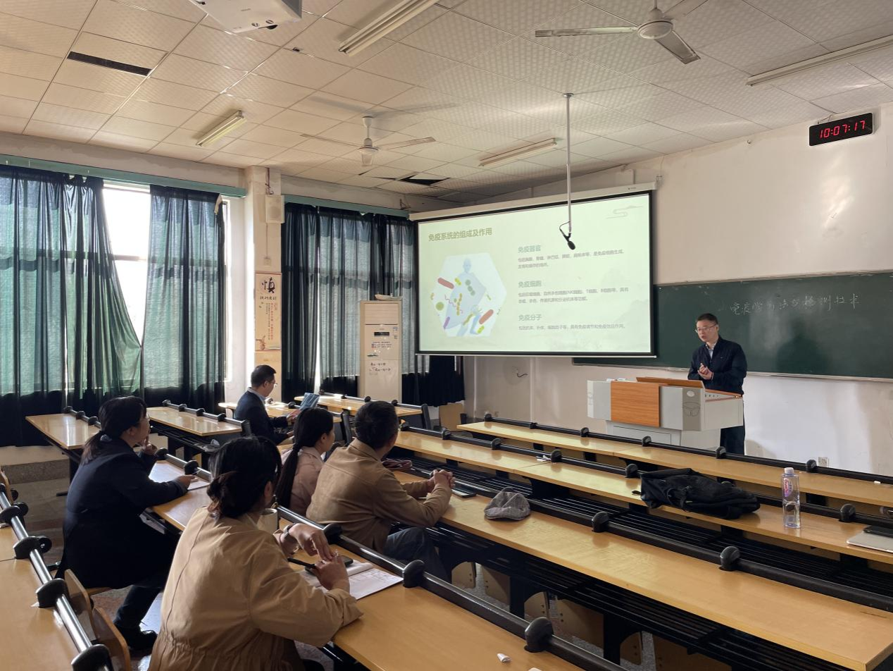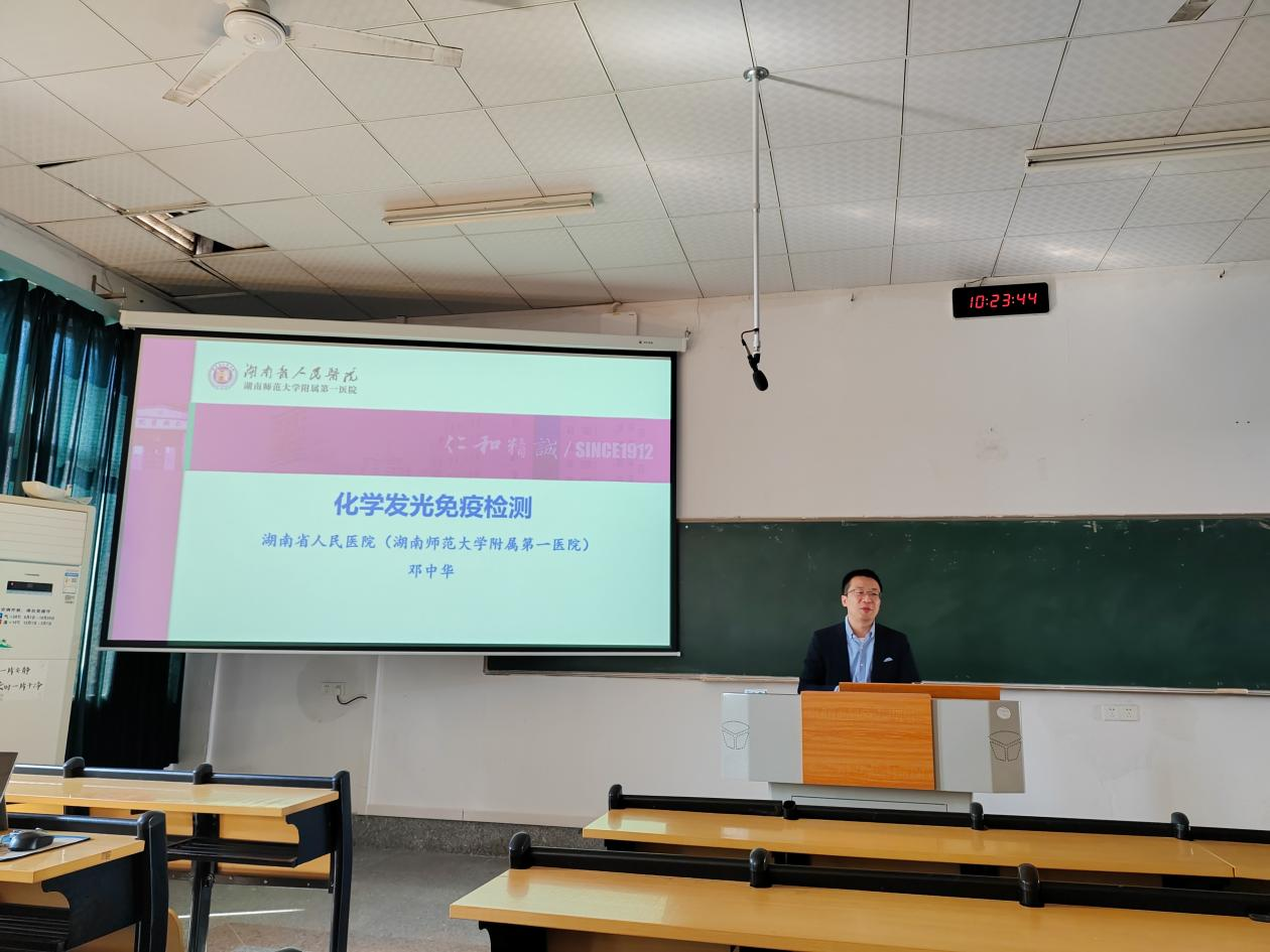 10月24日上午,英国365集团第一附属医院湖南省人民医院检验医学科袁浩、邓中华两位教授在勤医楼八教室进行了临床免疫学检验课程的授课。医学检验系主任叶湘漓教授、免疫学教研室主任张霞老师、微生物学与寄生虫学教研室主任廖旻晶老师、临检教研室主任陶科老师以及李涛、蒋海叶等老师参加了此次试讲工作。