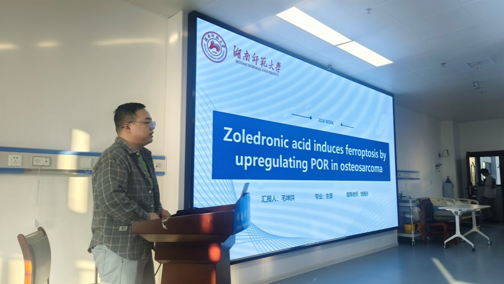 然后,毛坤洪同学对2023年4月发表在Medical Oncology上的题为“Zoledronic acid induces ferroptosis by upregulating POR in osteosarcoma”的研究性论文展开了汇报。该文献聚集了当下热门话题铁死亡,检测了ZOL在MG63和143B骨肉瘤细胞株中的作用,并研究了POR在铁死亡中的作用机制。研究发现ZOL能上调POR的表达并诱导骨肉瘤细胞发生铁死亡,敲低POR表达能抑制各种途径的铁死亡,并通过构建动物模型再次验证了ZOL能抑制骨肉瘤生长,上调POR表达。这些发现证明了ZOL能有效抑制骨肉瘤细胞株的增殖,并发现POR在铁死亡的途径中起到重要作用。因此围绕POR的作用机制可能为肿瘤治疗提供新的方案。
