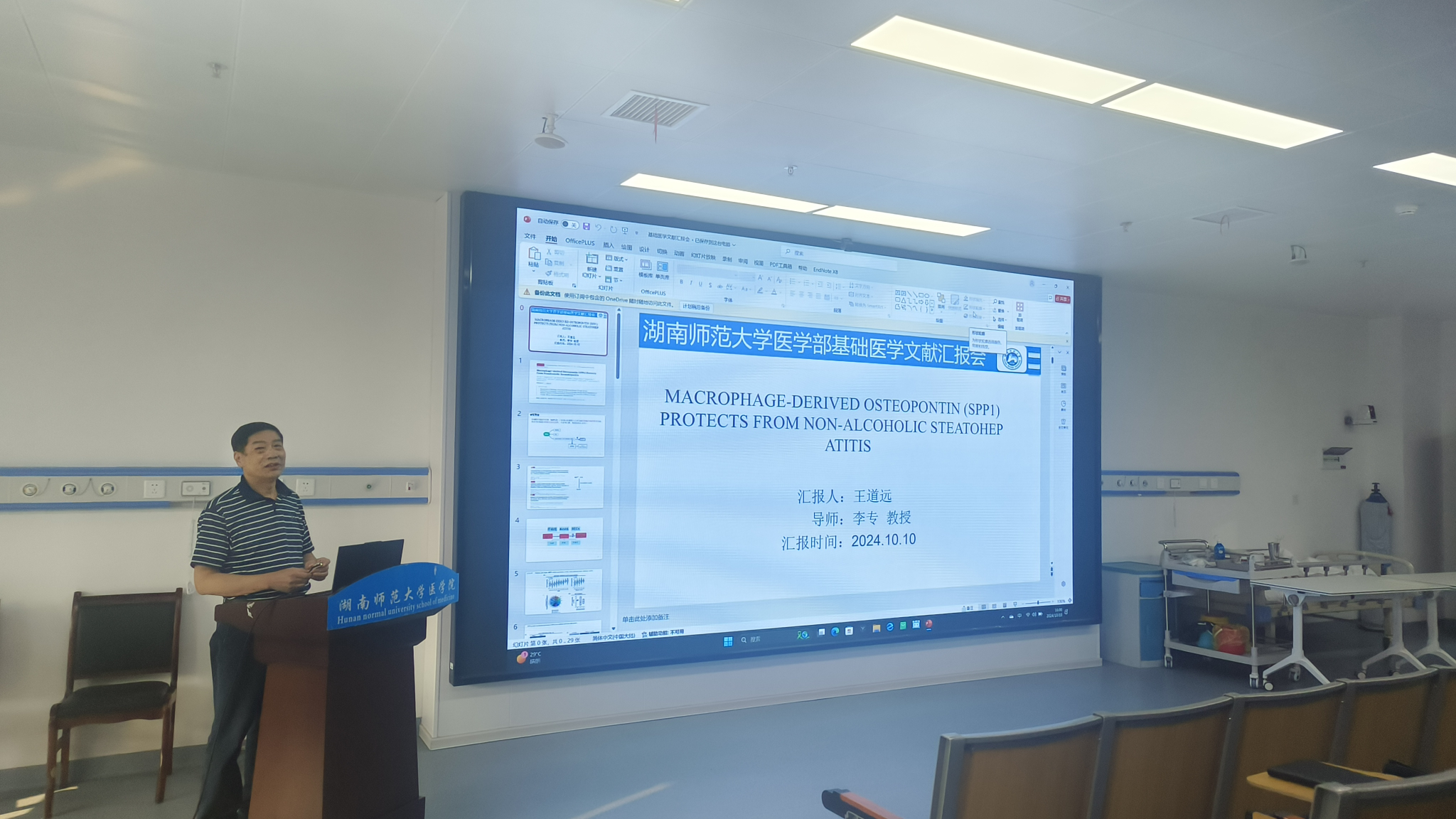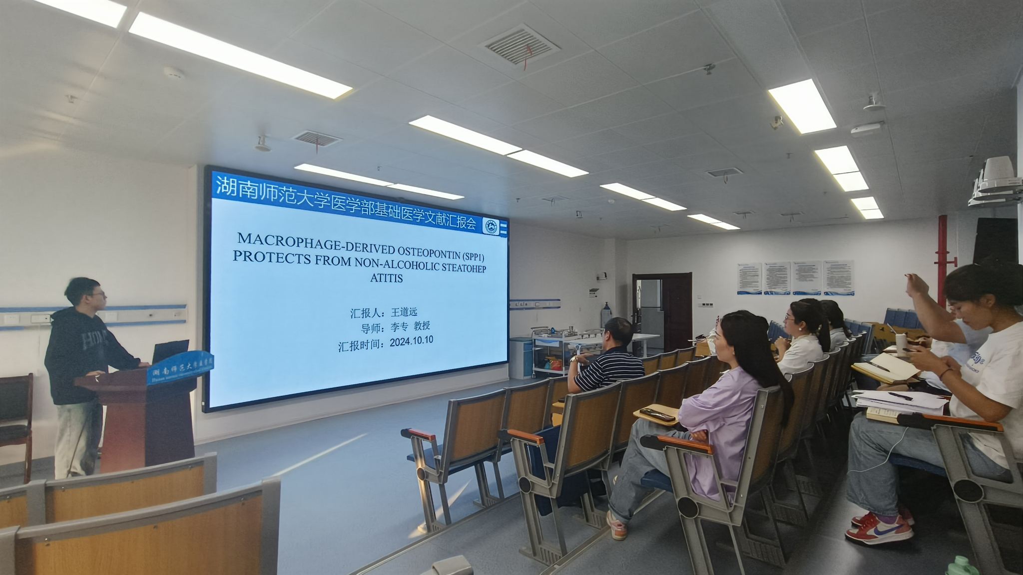首先,博士研究生王道远对2023年发表在Gastroenterology的一篇研究性论文“Macrophage-Derived Osteopontin(SPP1) Protects From Non-Alcoholic Steatohepatitis”进行汇报。该研究揭示了巨噬细胞来源的骨桥蛋白对非酒精性脂肪性肝炎的保护作用,并阐明了具体的分子机制。
