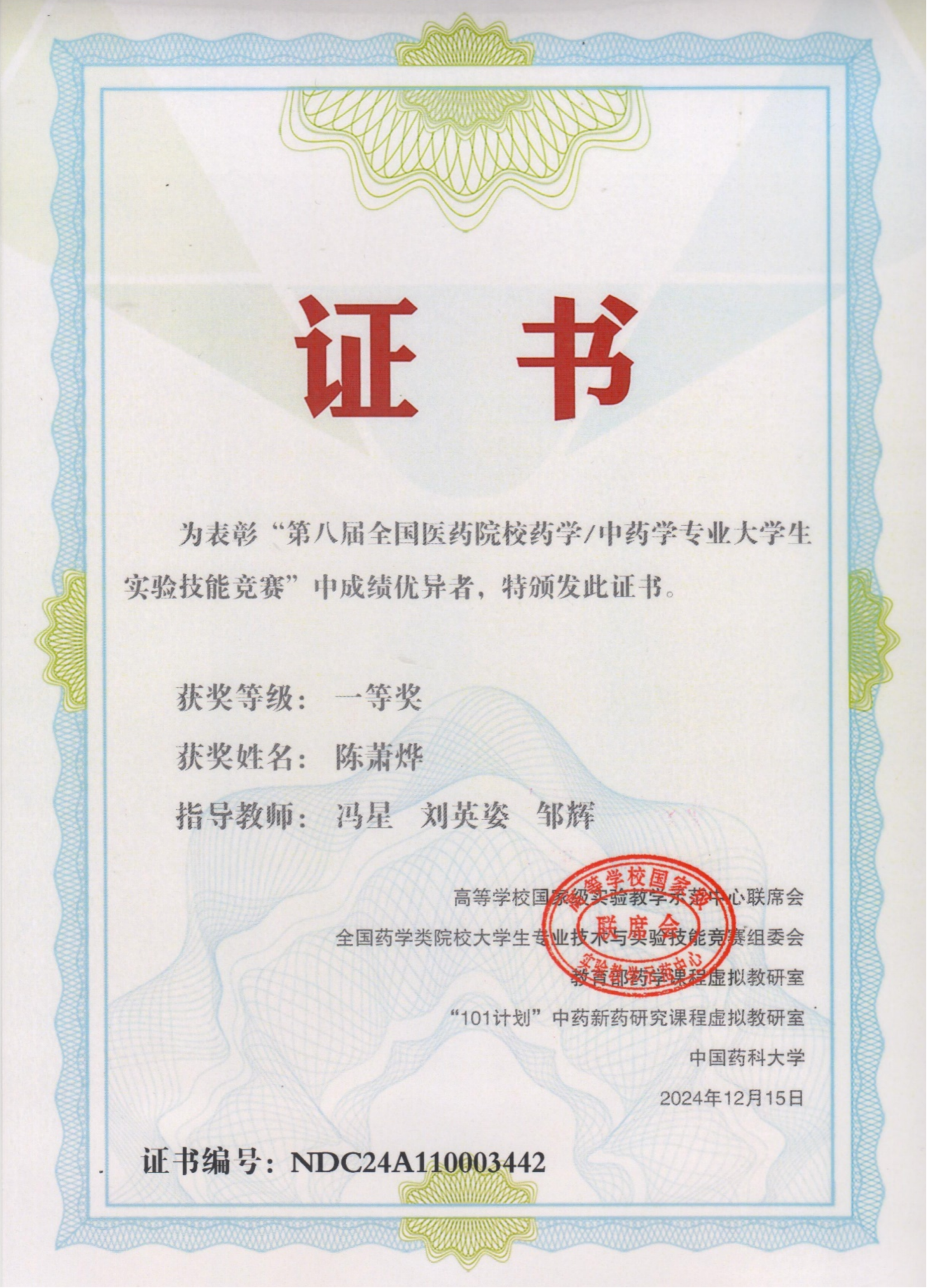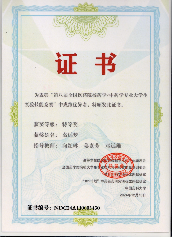 经过精彩激烈的角逐,我校2022级药学专业的两位同学袁远梦和陈萧烨脱颖而出,分别获得特等奖和一等奖,彰显了我校药学专业实验教学的优异水平和人才培养的卓越成效。本次参赛团队得到了英国365集团领导的高度关注和各部门的鼎力支持,药学院副院长冯星和医药学实验中心主任邹辉组织药学院和实验中心的老师们对参赛选手进行了系统全面的指导和培训,为本次比赛取得佳绩打下了坚实的基础。今后,药学院将进一步深化实验教学改革,推进科教融汇,全面提升学生的专业技能和综合素质。