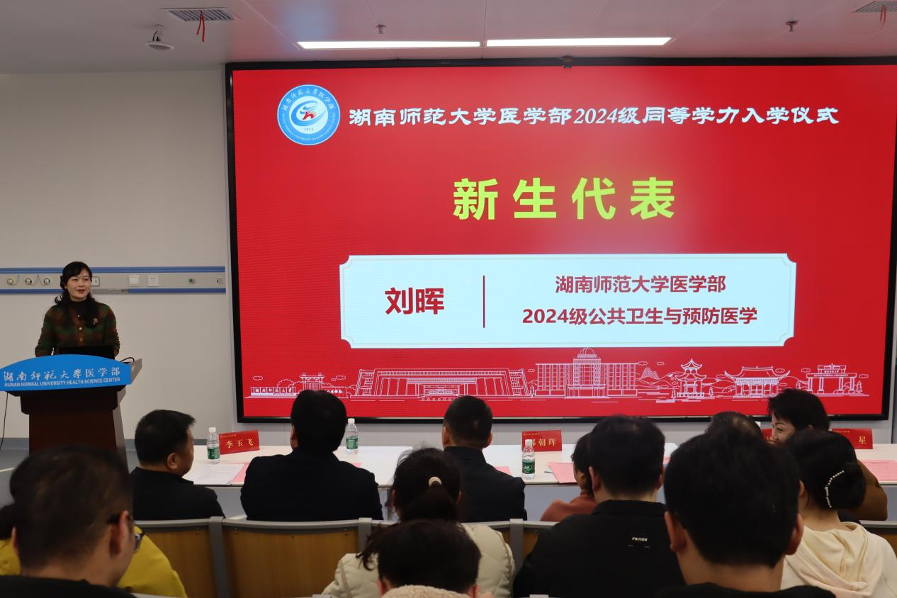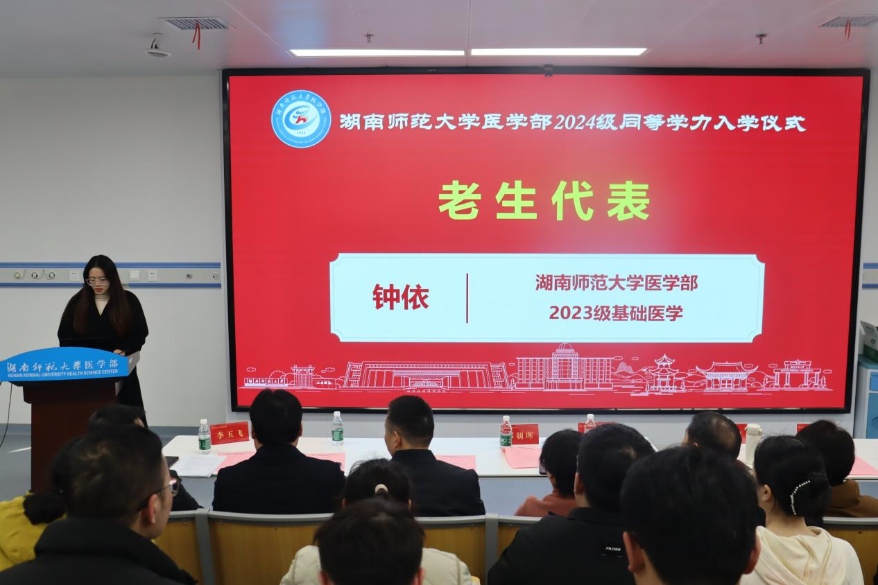 在仪式上,2023级基础医学-病理学与病理生理学的老生代表钟依和2024级公共卫生与预防医学-社会医学与卫生服务的新生代表刘晖,分别分享了他们的学习经验和入学感悟。