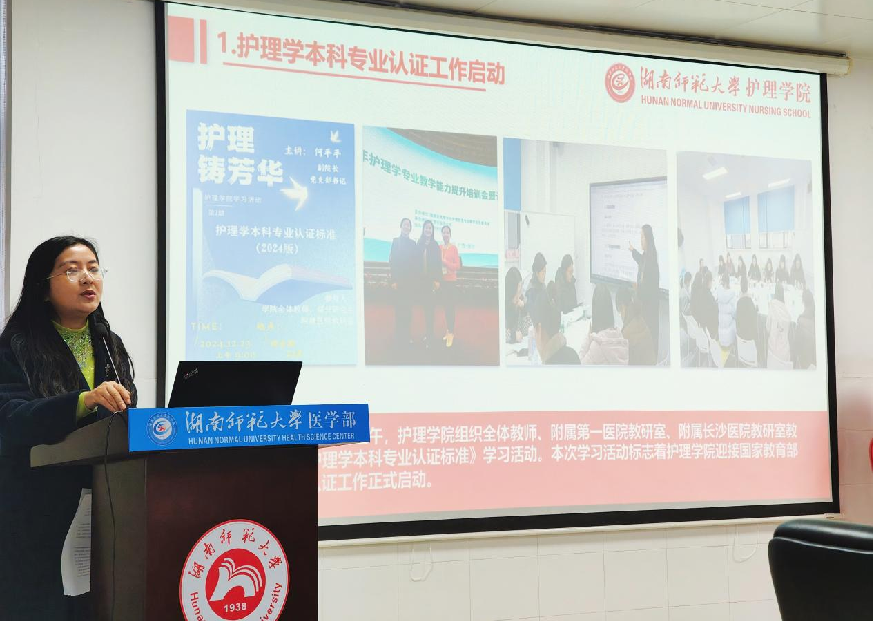 护理学院副院长兼党支部书记何平平从护理学专业认证前期准备、工作思路以及存在的问题三个方面汇报了护理学专业认证工作的准备情况,希望学校和教务处在专业认证资料准备和工作安排过程给予指导。