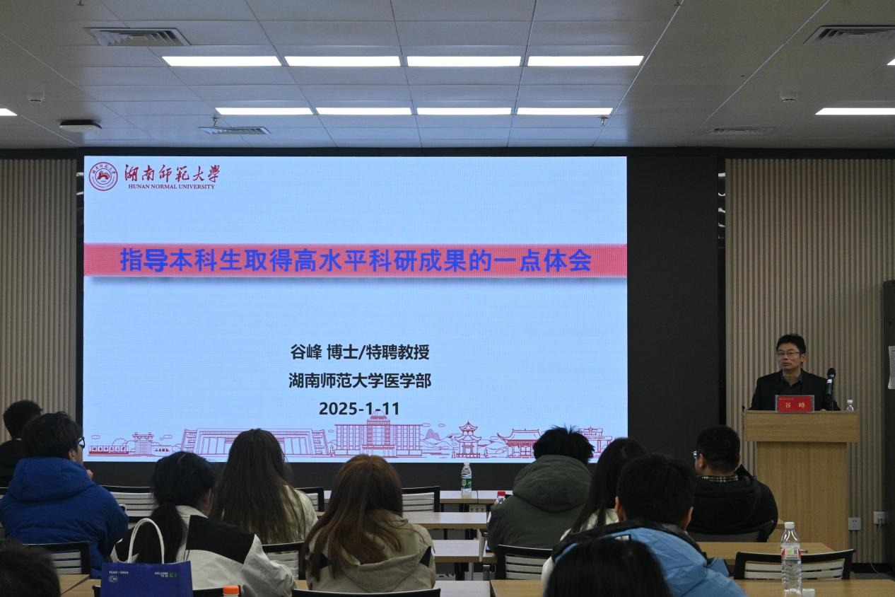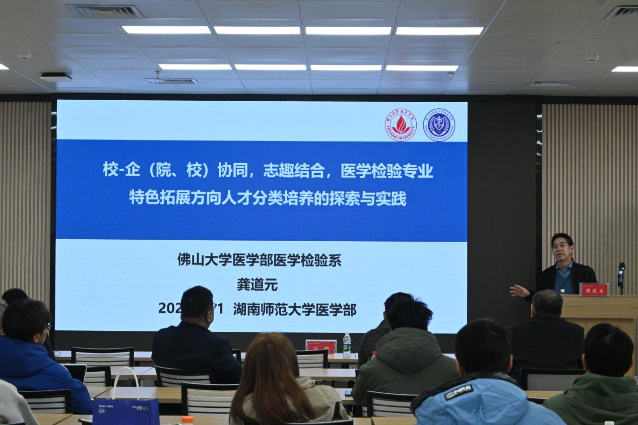吴敏就全国大学生生命科学竞赛对学生们进行竞赛指导。吴敏从网络评审标准、参赛报名情况、获奖比例等多方面为同学们介绍了科学探究和创新创业两大赛道。杨小平的讲话主题为“‘创’见非凡,智启‘新’程”。他提出创新对医学生的重要性,为学生们提供医学生创新创业的方向指导,鼓励同学们跨学科学习,将实践与理论相结合以及多多参加创新竞赛活动。龚道元围绕医学检验专业特色拓展方向人才分类培养的探索与实践这一话题与同学们进行探讨。结合自己的教学经历,向同学们讲述了特色拓展方向人才培养和创新特色教材编写的探索与实践相关内容。谷峰则跟同学们分享了指导本科生取得高水平科研成果的体会。他用“什么是科研”以及“本科生为什么要做科研”两个问题引入话题,让同学们对科研有了简单了解。李专以慢性肝病研究为例,向学生们介绍医学创新思路与方法。他从主持科研项目情况、发表论文情况、学术团体任职情况等方面对自己做了简单介绍。陶晓军为同学们讲授大学生创新创业教育理念与实践相关知识。他结合中国文化来解析个人能力,让同学们了解到个人综合能力的重要性。金摇光通过分析创新大赛的优秀项目,为同学们解答了大赛中的常见问题。