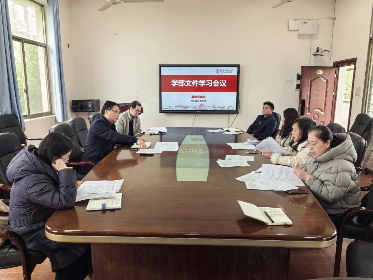 2月25日上午,基础医学院在仁雅楼405会议室召开了学部文件学习会议。会议由基础医学院罗怀青副院长主持。