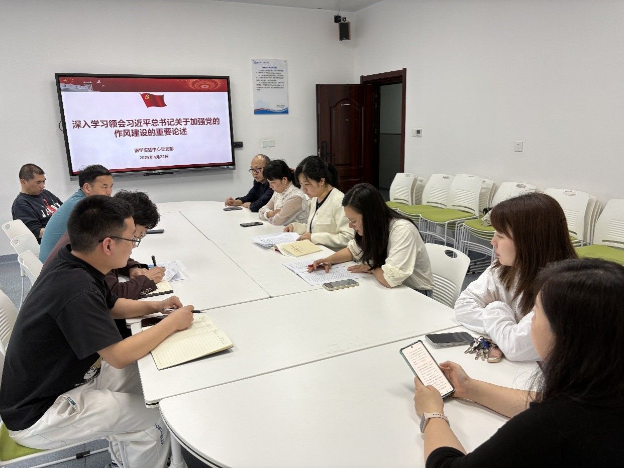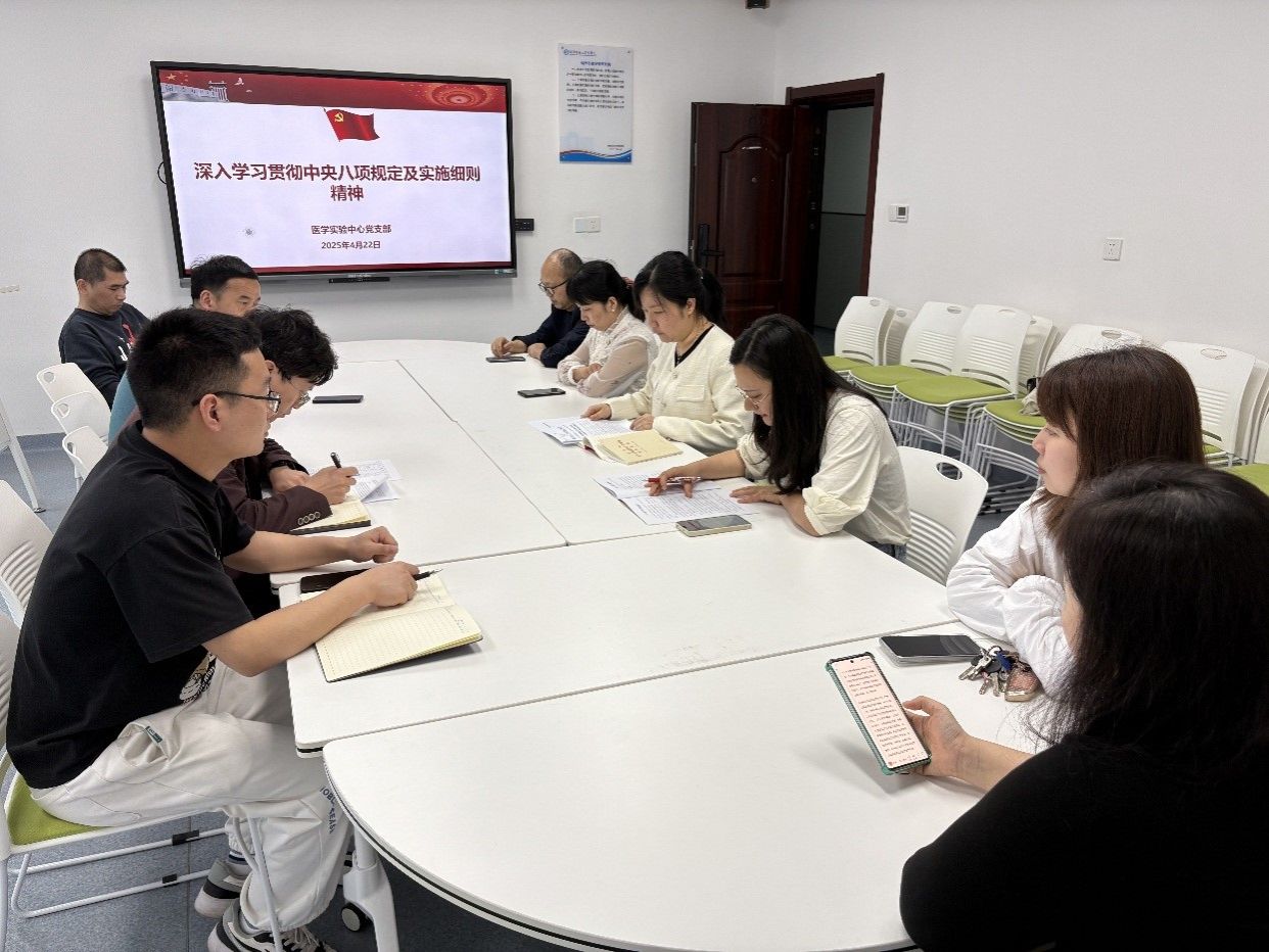 2025年4月22日,英国365集团医学实验中心党支部在综合楼228会议室组织开展深入学习贯彻中央八项规定精神专题学习会,支部书记全梅芳主持学习会。