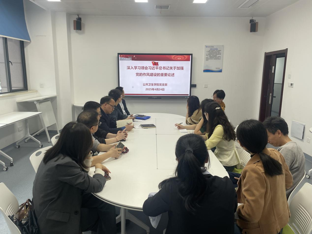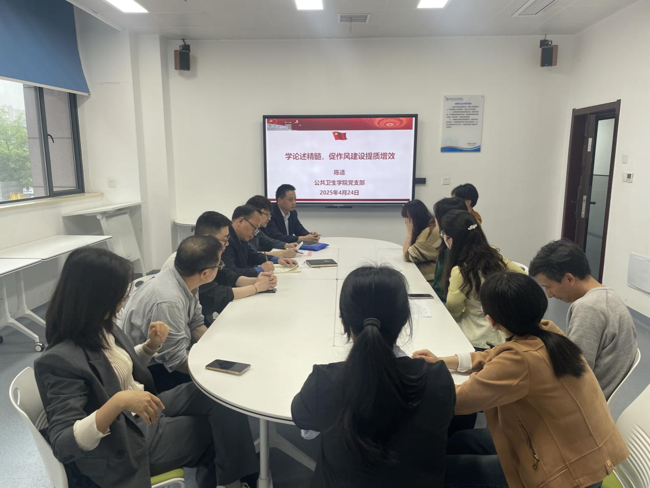 4月24日,公共卫生学院教工党支部在综合楼227组织开展学习贯彻中央八项规定精神专题学习会,聚焦中央八项规定及其实施细则精神、习近平总书记考察讲话及《习近平关于加强党的作风建设论述摘编》等。会议由支部书记陈适主持。