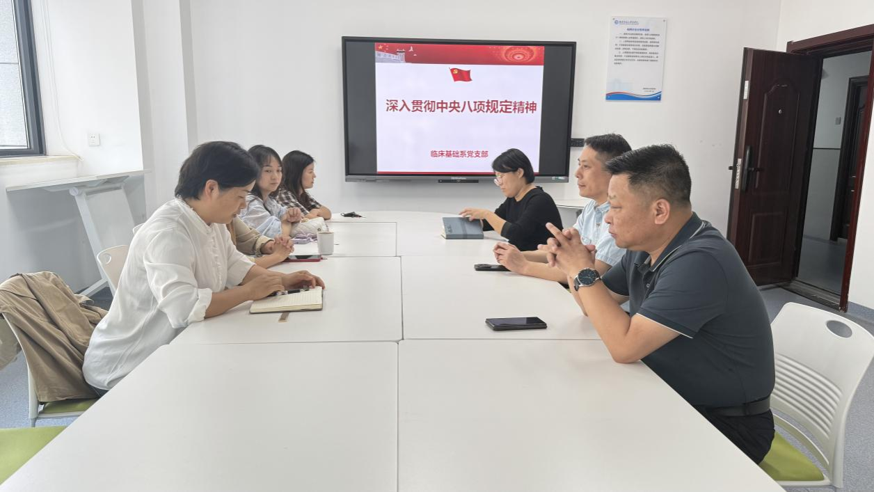 4月28日,临床基础系党支部在综合楼227室召开深入学习贯彻中央八项规定精神专题学习会,会议由党支部书记李健主持,医学教务处副处长李玉飞及支部党员参会。