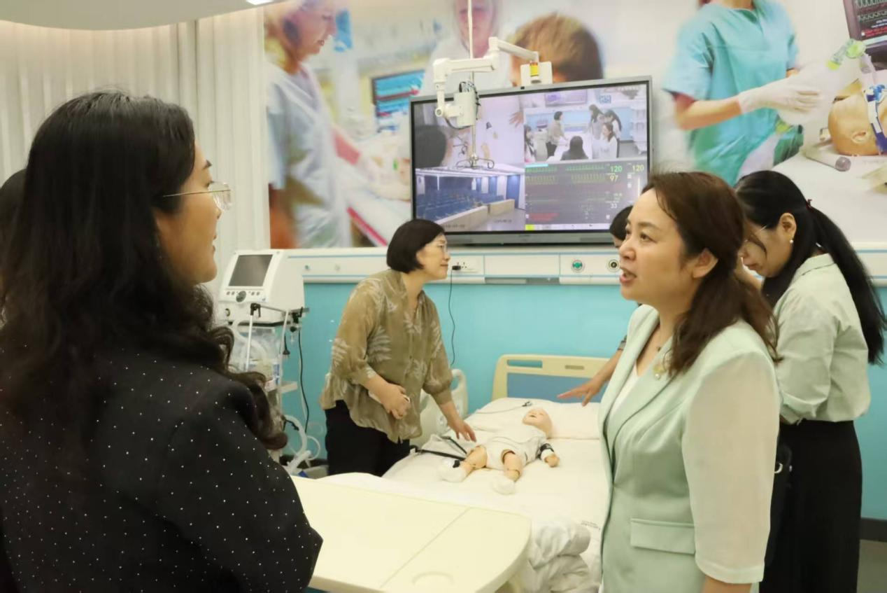 接着由柏亚妹院长带领我们参观实训中心,包括基础护理实验区、专科护理实验区、虚拟仿真实验区,中医特色护理实验区,体现了全生命周期照护、人工智能的前沿性。