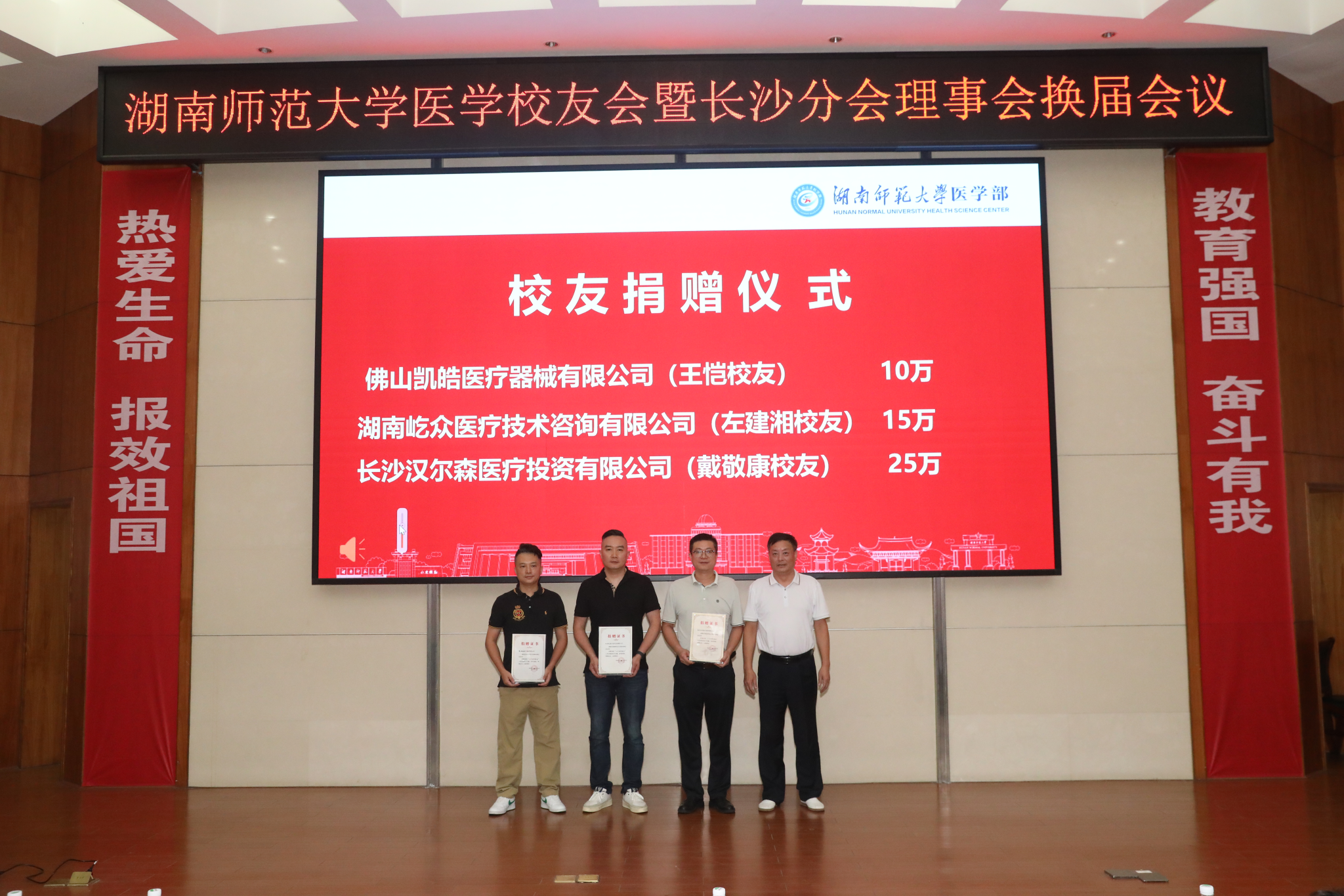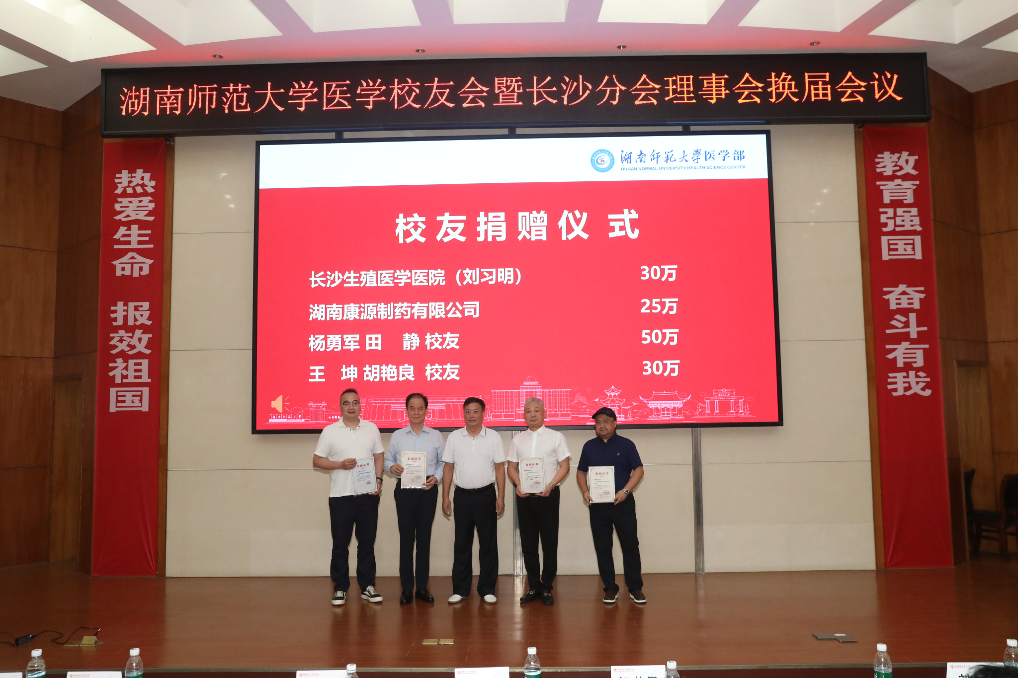 校友捐赠仪式上,王辉为长沙生殖医学医院院长刘习明、湖南康源制药有限公司、杨勇军-田静伉俪兼校友、王坤-胡艳良伉俪兼校友、佛山凯皓医疗器械有限公司王恺校友、湖南屹众医疗技术咨询有限公司左建湘校友、长沙汉尔森医疗投资有限公司戴敬康校友等颁发捐赠证书。