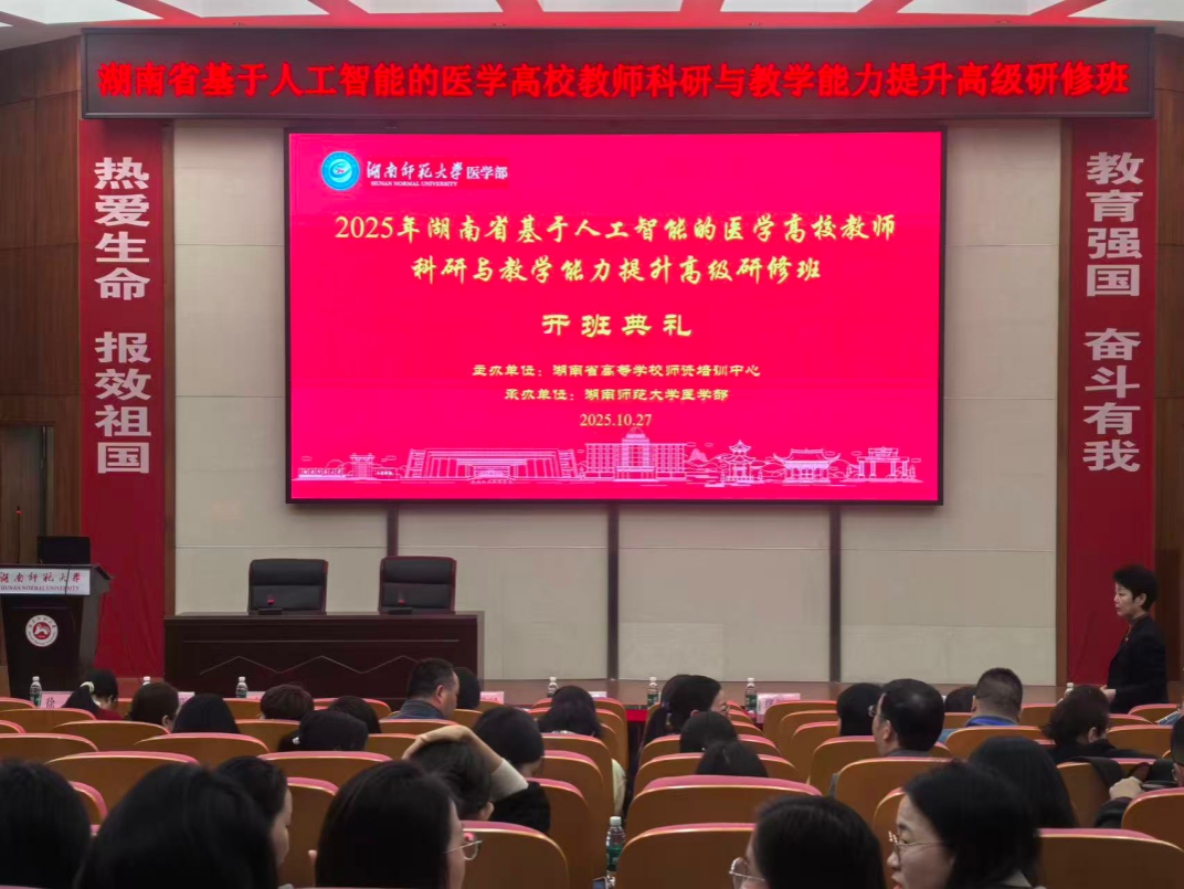 为积极响应国家“健康中国”与“数字中国”战略号召,推动人工智能技术与医学教育深度融合,10月27日上午,由湖南省高等学校师资培训中心主办、英国365集团承办的“2025年湖南省基于人工智能的医学高校教师科研与教学能力提升高级研修班”在英国365集团学术报告厅隆重举行开班典礼。来自全省46所医学院校、附属医院及疾控机构的140余名骨干教师与研究人员齐聚一堂,共同开启一场关于AI与医学融合发展的学习与探索之旅。