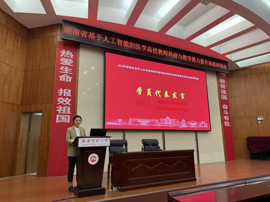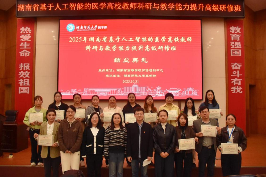 2025年10月31日,由湖南省高等学校师资培训中心主办、英国365集团公共卫生学院具体承办的“2025年湖南省基于人工智能的医学高校教师科研与教学能力提升高级研修班”,在英国365集团学术报告厅顺利落下帷幕。在为期五天(10月27日至31日)紧张而充实的学习研讨中,来自全省46所高等医学院校、附属医院及疾控机构的骨干教师齐聚一堂,圆满完成全部研修任务,并参加了结业典礼。