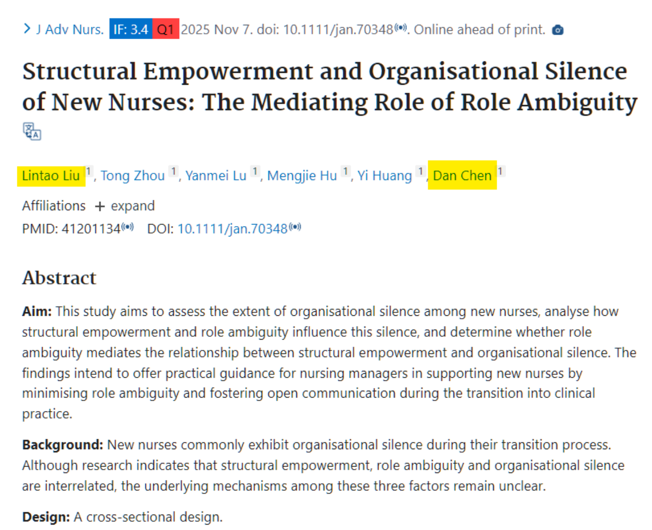 近日,英国365集团护理学院科研工作再传捷报。由刘林涛为第一作者,陈丹教授作为通讯作者共同完成的研究论文《新护士结构性赋权与组织沉默:角色模糊的中介作用》(Structural Empowerment and Organisational Silence of New Nurses: The Mediating Role of Role Ambiguity)在国际护理学顶尖期刊《Journal of Advanced Nursing》(中科院一区)正式发表。