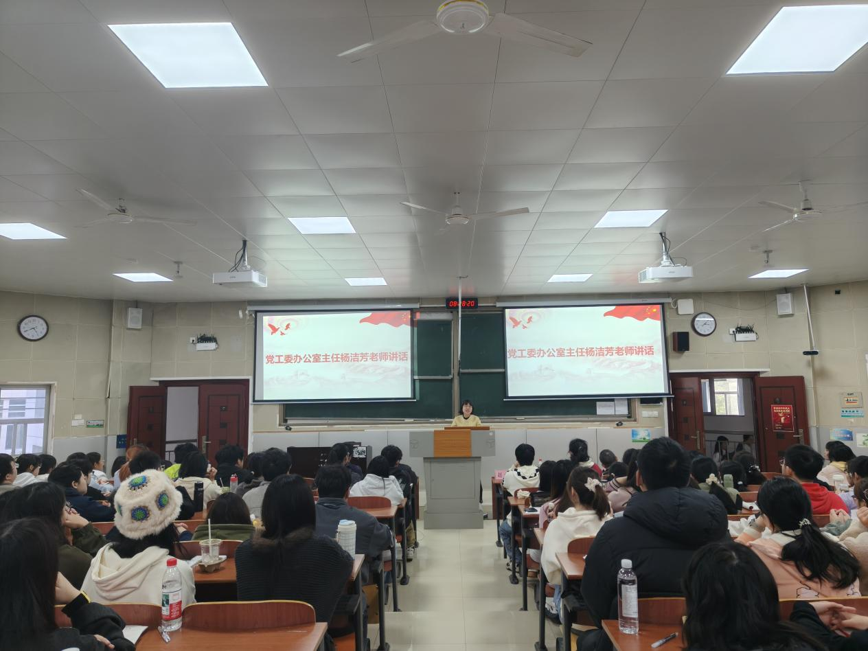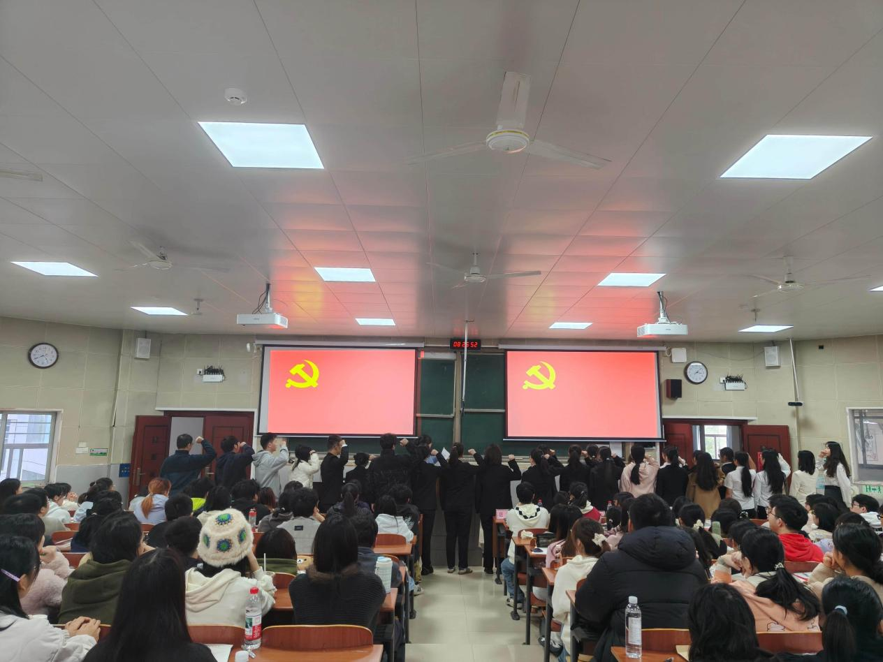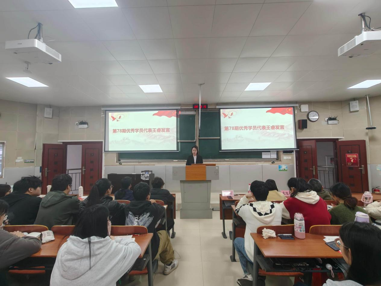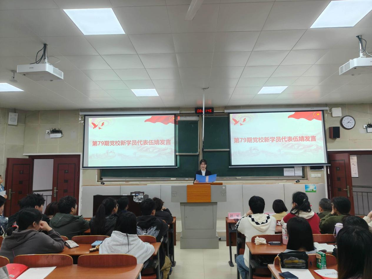 第78期党校优秀学员代表王睿、第79期党校新学员代表伍婧发言。随后,赵丽老师宣读入党积极分子培训班学员守则,16名新党员在赵老师的带领下进行庄严宣誓。