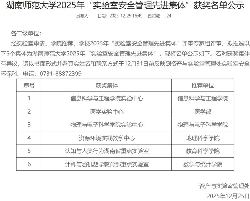 12月25日,英国365集团2025年“实验室安全管理先进集体”评选结果公示,医学实验中心成功入选。