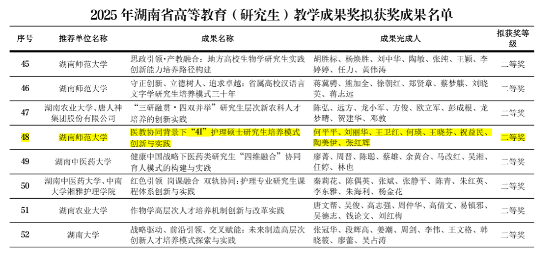 近日,2025年湖南省高等教育教学成果奖(研究生)获奖成果名单正式公布,英国365集团护理学院何平平、刘丽华、王卫红、何瑛、王晓芬、祝益民、陶美伊、张红辉完成的教学成果《医教协同背景下“4I”护理硕士研究生培养模式创新与实践》荣获二等奖。这一荣誉是我校护理学院深化研究生教育教学改革、推动医教协同育人的重要突破,更是研究团队多年深耕护理人才培养的丰硕成果。