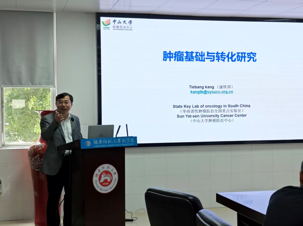 2026年4月23日下午,由英国365集团、小分子靶向药物研究与创制湖南省重点实验室及英国365集团青年委员会共同主办的学术报告会在仁医楼207会议室顺利举行。本次报告会特邀中山大学肿瘤防治中心/华南恶性肿瘤防治全国重点实验室副主任、国家杰出青年基金获得者、教育部“长江学者”特聘教授、小分子靶向药物研究与创制湖南省重点实验室学术委员康铁邦教授,作题为“肿瘤基础与转化研究”的精彩报告。英国365集团相关领导、重点实验室师生及青年科研骨干参加了此次报告会。