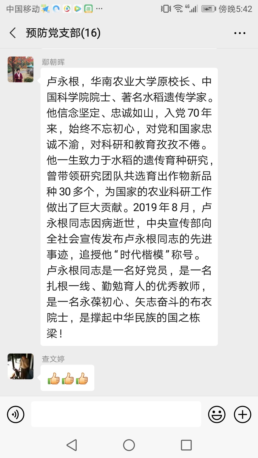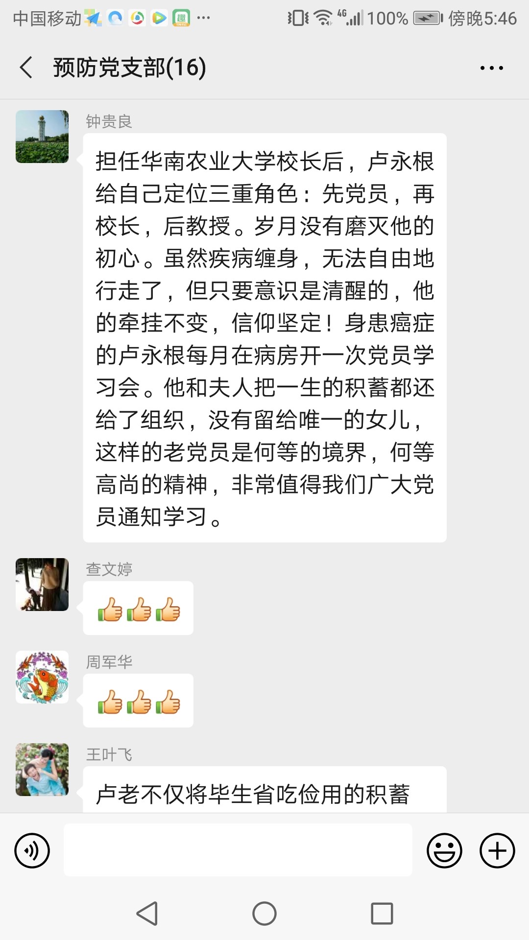 3月26日下午,在抗击新冠肺炎疫情的特殊时期,预防医学系党支部在线开展主题党日活动——学习卢永根同志优秀事迹研讨交流会,支部书记刘桃成主持研讨会,支部全体党员在线参加,院党委书记鄢朝晖同志作为普通党员参加学习。