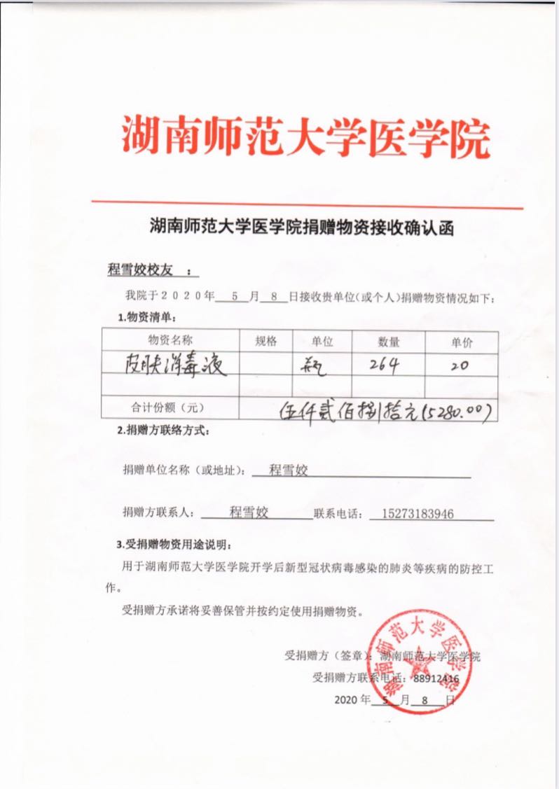 2003级药学系校友向延明、2008级护理系校友程雪姣等校友分别以个人名义,亲自前往学院,为我院捐赠免洗手消毒液500余瓶,支持我院抗击疫情。两位校友都是各自岗位上的佼佼者,有着强烈的社会责任与担当。他们表示,自己在校学习期间,一直得到学院及老师们的悉心教导和关爱资助。疫情当前,他们希望能为母校做一点自己的贡献,表达对老师和学弟学妹的关爱,与母校共克时艰,一起打赢这场疫情防控阻击战。