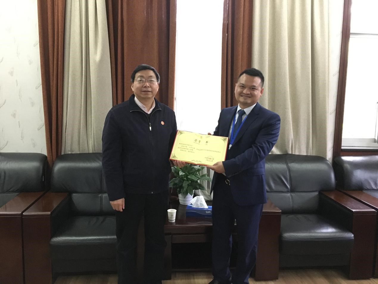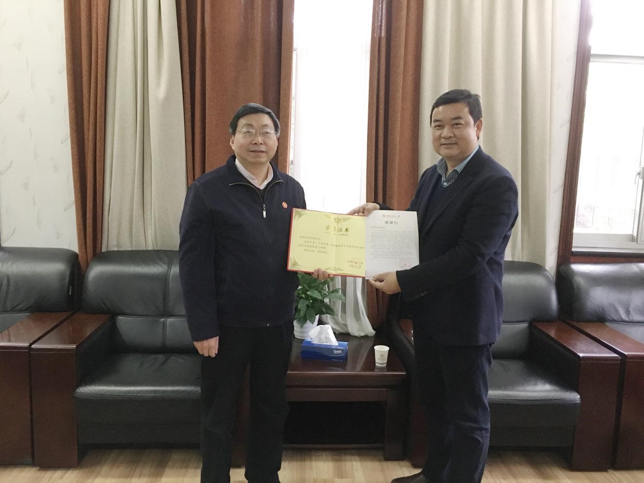 3月31日下午,我校校友、湖南普瑞康医疗用品有限公司董事长李光焰,湖南普瑞康医疗用品有限公司国际贸易部经理欧阳雪葵向我校捐赠2万个医用口罩。副校长匡乐满代表学校接受捐赠。