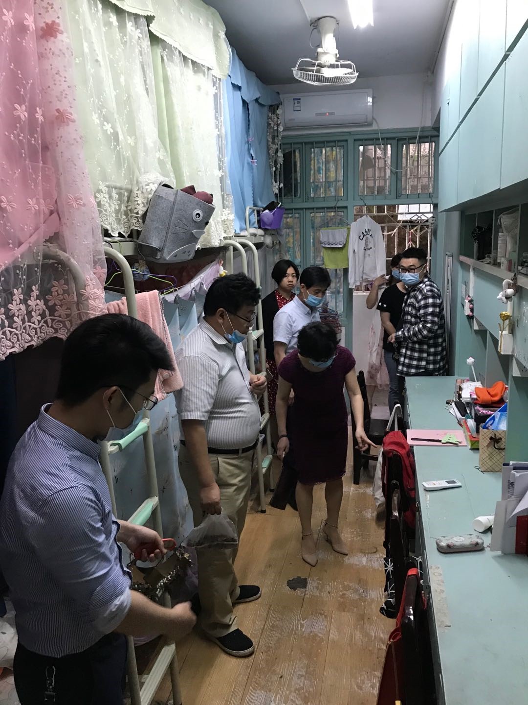 5月11日,为全力做好疫情防控期间学生返校工作,保障学生返校后的健康安全及生活需求,我院党委书记鄢朝晖、副书记陈松、咸嘉湖校区后勤服务中心副主任李文虎以及学工办全体辅导员查看学生宿舍情况,针对防疫措施落实和安全措施保障等工作进行了现场检查。