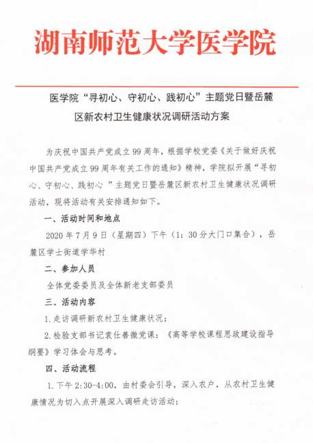 为庆祝中国共产党成立99周年,7月9日下午,我院党委组织全体支部委员赴岳麓区学士街道学华村开展‘寻初心、守初心、践初心’主题党日暨岳麓区新农村卫生健康状况调研活动。