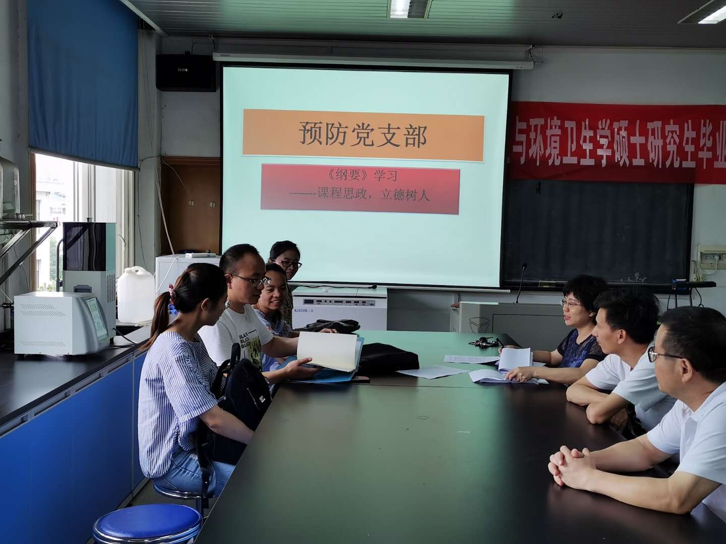 7月10日下午,我院预防医学党支部开展学习《高等学校课程思政建设指导纲要》主题党日活动, 支部书记陈适主持学习活动。