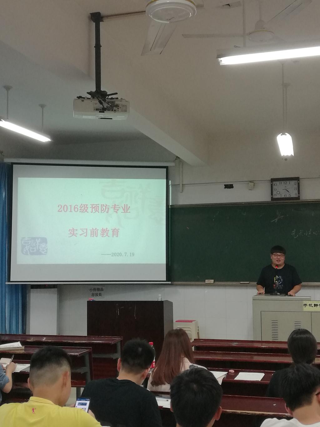 7月19日下午,2016级预防医学学生专业实习前教育会议在我院召开,开福区疾控中心主任林玲、我院实习办主任赵燕玲、预防医学系主任刘桃成、预防系支部书记陈适及2016级预防班全体学生参加会议,刘桃成主持会议。