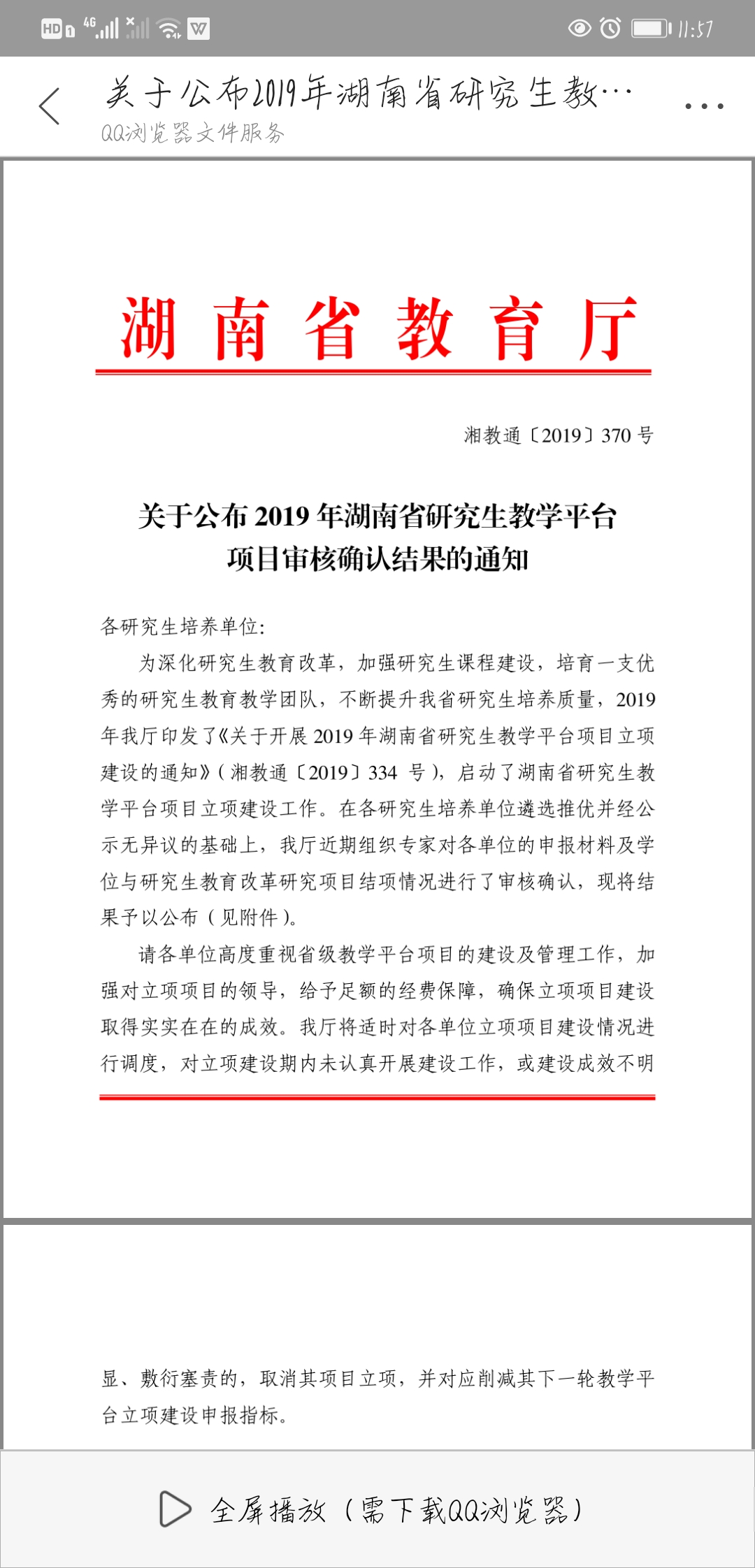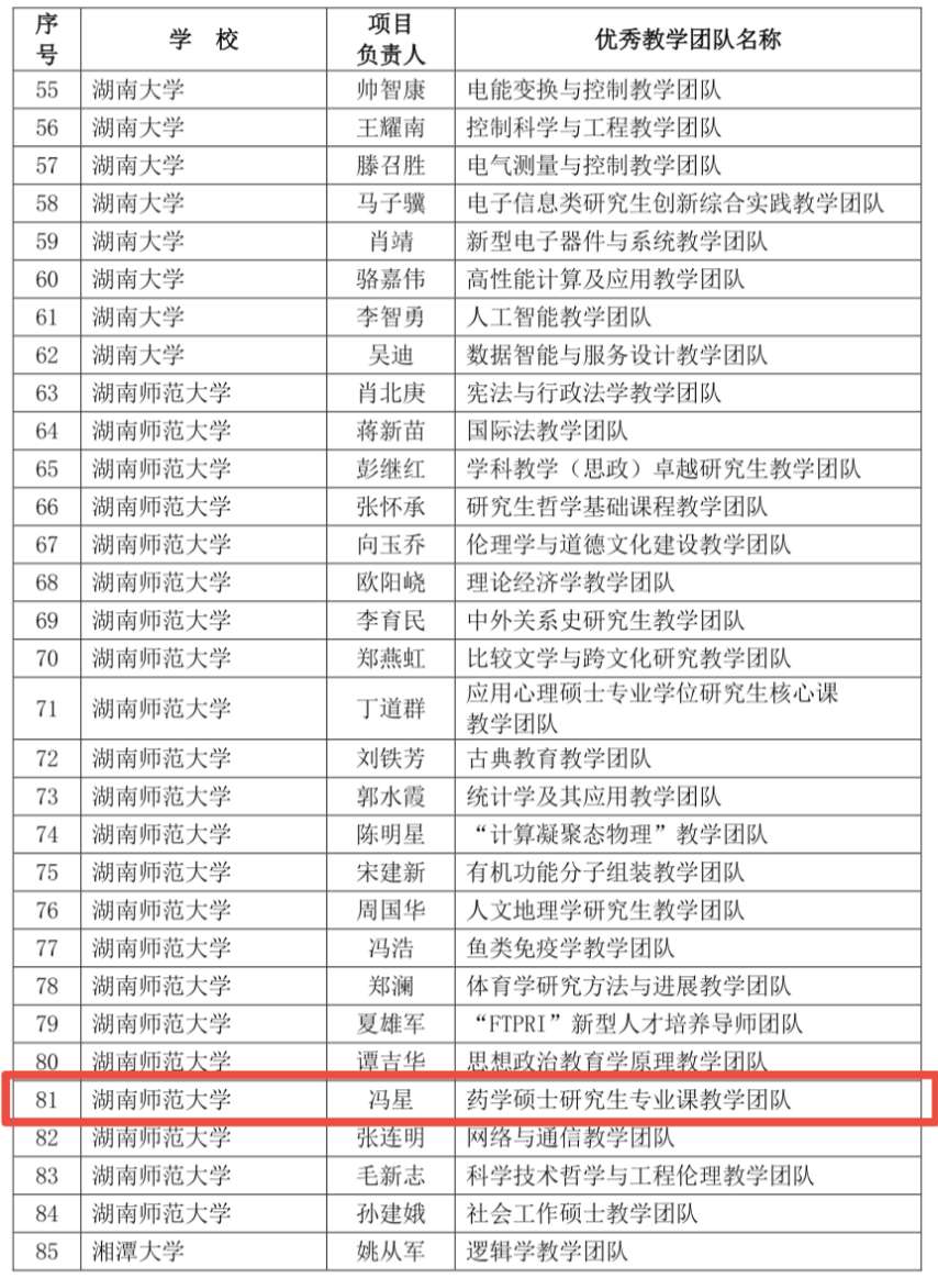 近日,省教育厅印发了《关于公布2019年湖南省研究生教育平台项目审核确认结果的通知》,我院推荐申报的多项研究生优质课题项目、研究生高水平教材项目和研究生优秀教学团队项目获得立项,且成功入选研究生优秀专业案例。