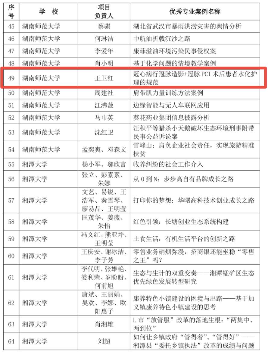 其中,研究生优质课题项目2项:杨小平等《靶向药物研究与设计》,吕媛等《医学统计学》;研究生高水平教材项目1项:贺丽萍等《实用组织化学与细胞化学技术》;研究生优秀教学团队项目1项:冯星等《药学硕士研究生专业课教学团队》;王卫红等《冠心病行冠脉造影+冠脉PCI术后患者水化护理的规范》入选2019年研究生优秀专业案例。