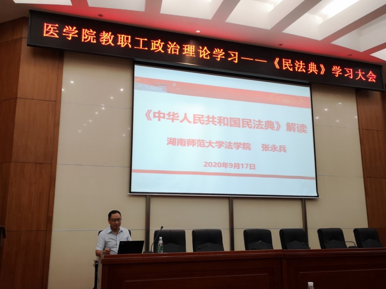 张永兵在讲座中指出,第十三届全国人民代表大会第3次会议上通过的《中华人民共和国民法典》,是新中国第一部以法典命名的法律,是新中国截至目前体量最为庞大的法律,被誉为“社会生活的百科全书”。作为事关每个公民“从胎儿到身故后五十年”漫长岁月切身利益保障的法律。他以扎实的专业功底,生动活泼的讲述形式,对《民法典》制定的历程、《民法典》的体系与价值以及颁布实施的重大意义进行了阐释,并结合大量与人民生活息息相关的实例,对《民法典》中的重要制度进行了解读,鼓励老师们善用法律武器保障自己的合法权益。