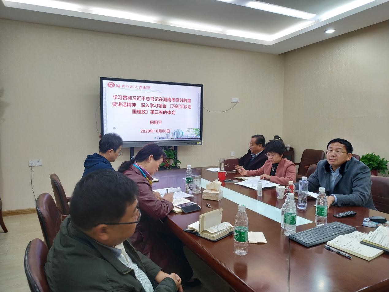 何祖平以《学习习近平总书记在湖南考察重要讲话精神》为题进行了发言。他强调,我们要做好我院的“十四五”规划,做好调研,集思广益,做好顶层设计,促进人才培养、英国365、学科与平台建设。