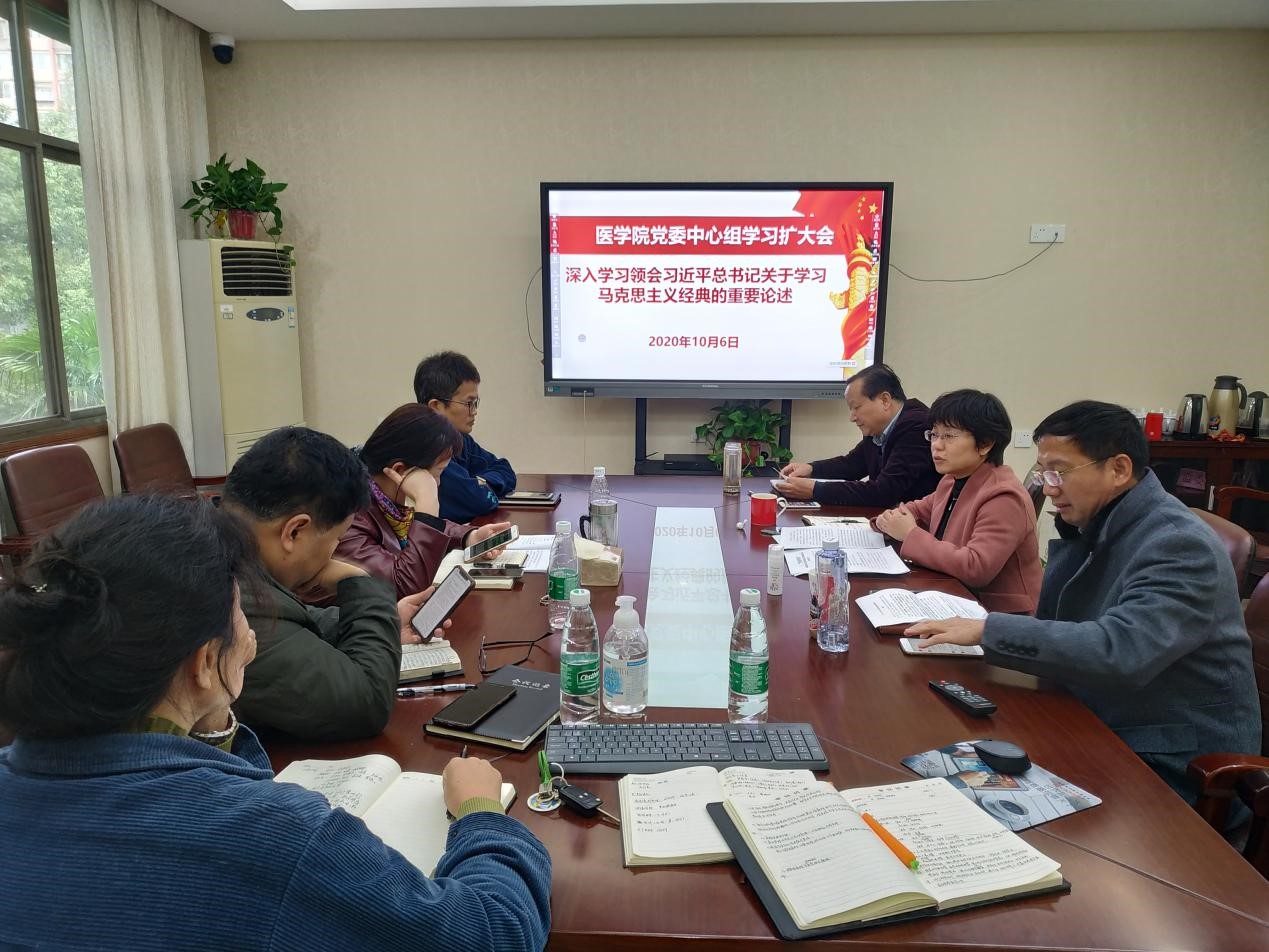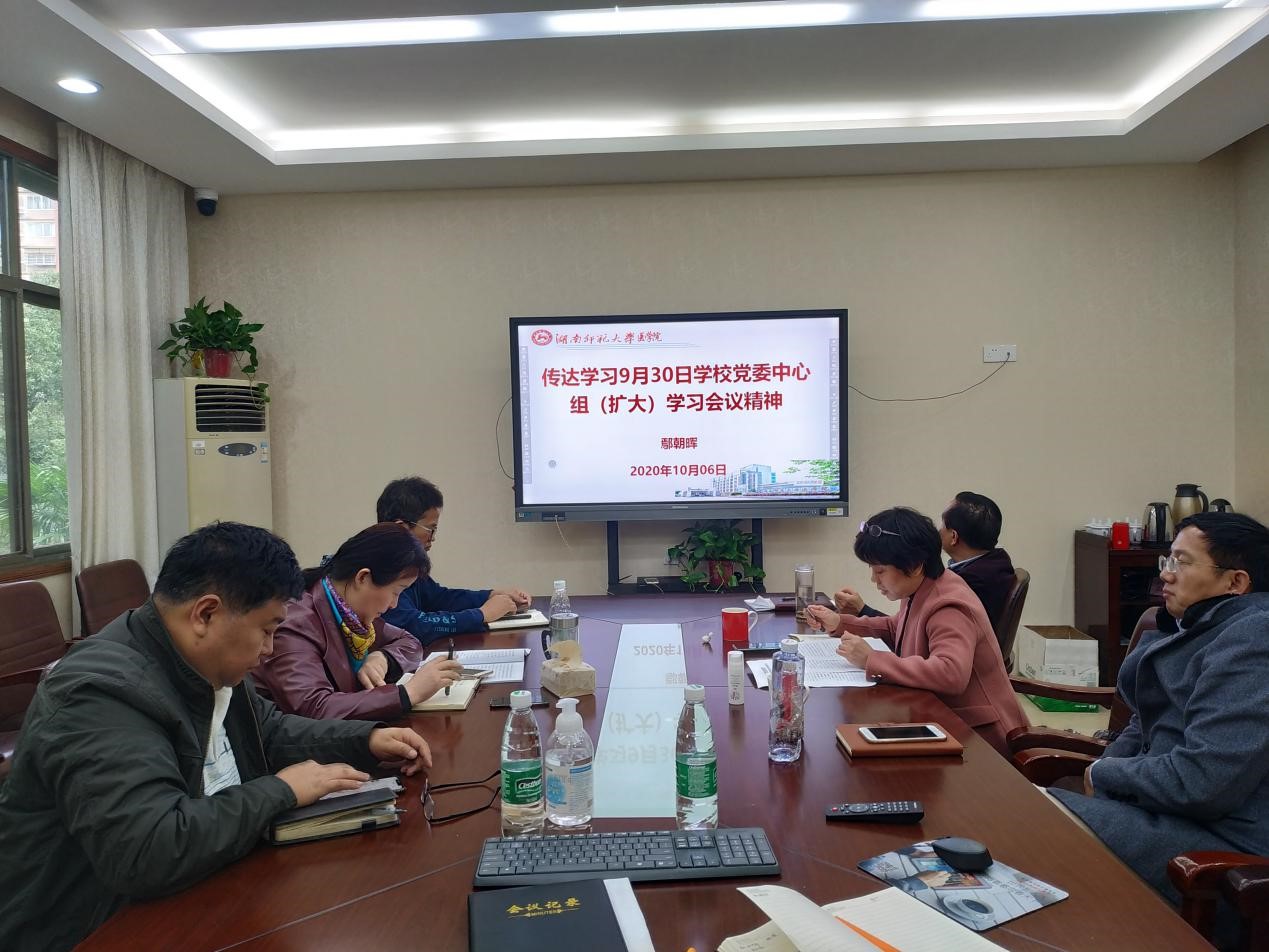 2020年10月6日上午,我院在办公楼三楼会议室召开本学期第三次中心组学习(扩大)会,党委中心组全体成员和院长助理及党委办、行政办主任参加了中心组学习。院党委书记鄢朝晖主持会议。