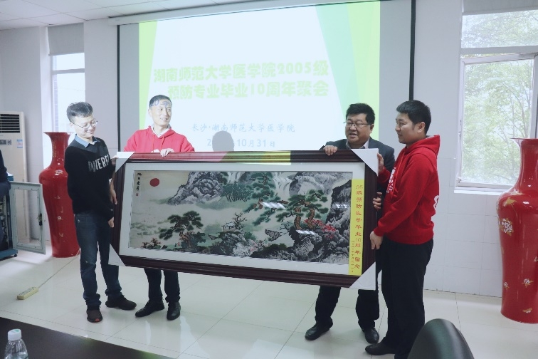 整个座谈会气氛活跃,掌声不断。座谈会最后,在全体师生的共同见证下,05级预防系校友代表向我院赠送了湘绣“旭日东升”,以祝愿母校更加辉煌,院党委副书记陈松、预防系党支部书记陈适接受捐赠。会后,校友们在学院里重寻当年的记忆,植物药园漫步、食堂打饭、球场奔跑、草地席坐,并与老师们合影留念。