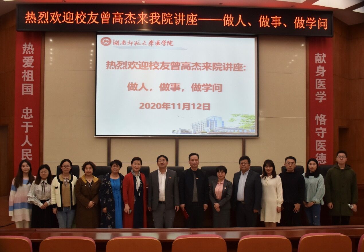11月12日下午,在我院学术报告厅,长沙市岳麓区政协党组副书记、副主席曾高杰为我院师生带来一场“做人、做事、做学问”主题讲座。我院全体行政管理人员和教辅人员、青年教工党员、全体研究生及本科生班干部聆听讲座,院长何祖平、副院长邓文艳、党委副书记陈松参会,院党委书记鄢朝晖主持讲座。