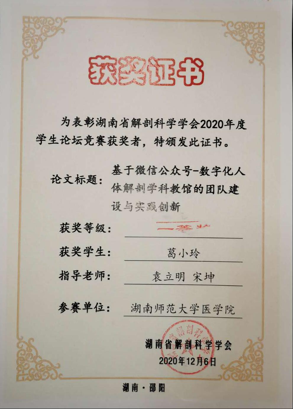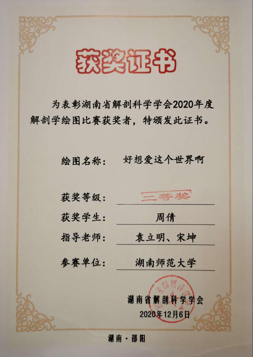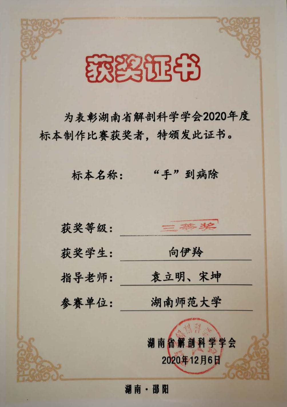 6日上午,解剖实践创新团队成员邢越、葛小玲参与2020年度学生论坛竞赛,均获得一等奖;汪坤,张焰,向伊羚参与标本制作比赛,分别获得二等奖、三等奖、三等奖;葛小玲、周倩参与解剖学绘图比赛,均获得二等奖。