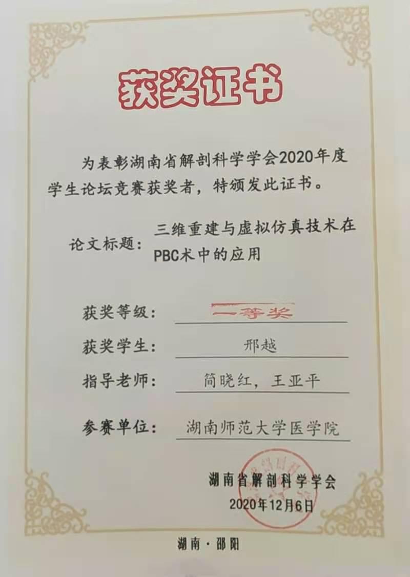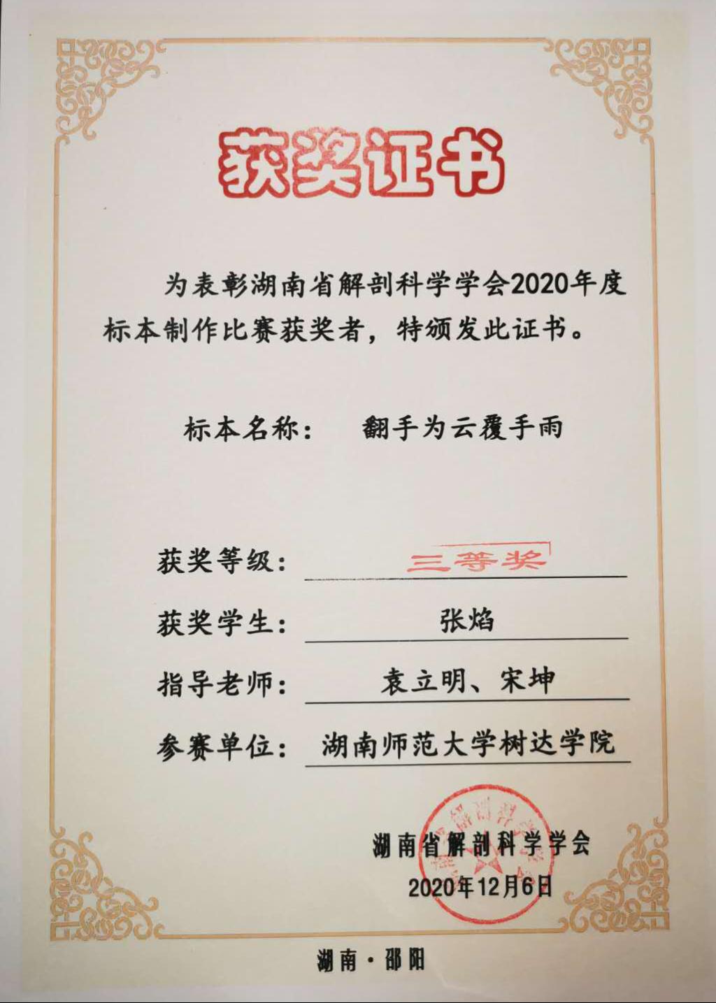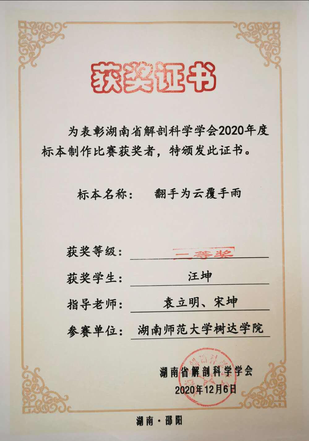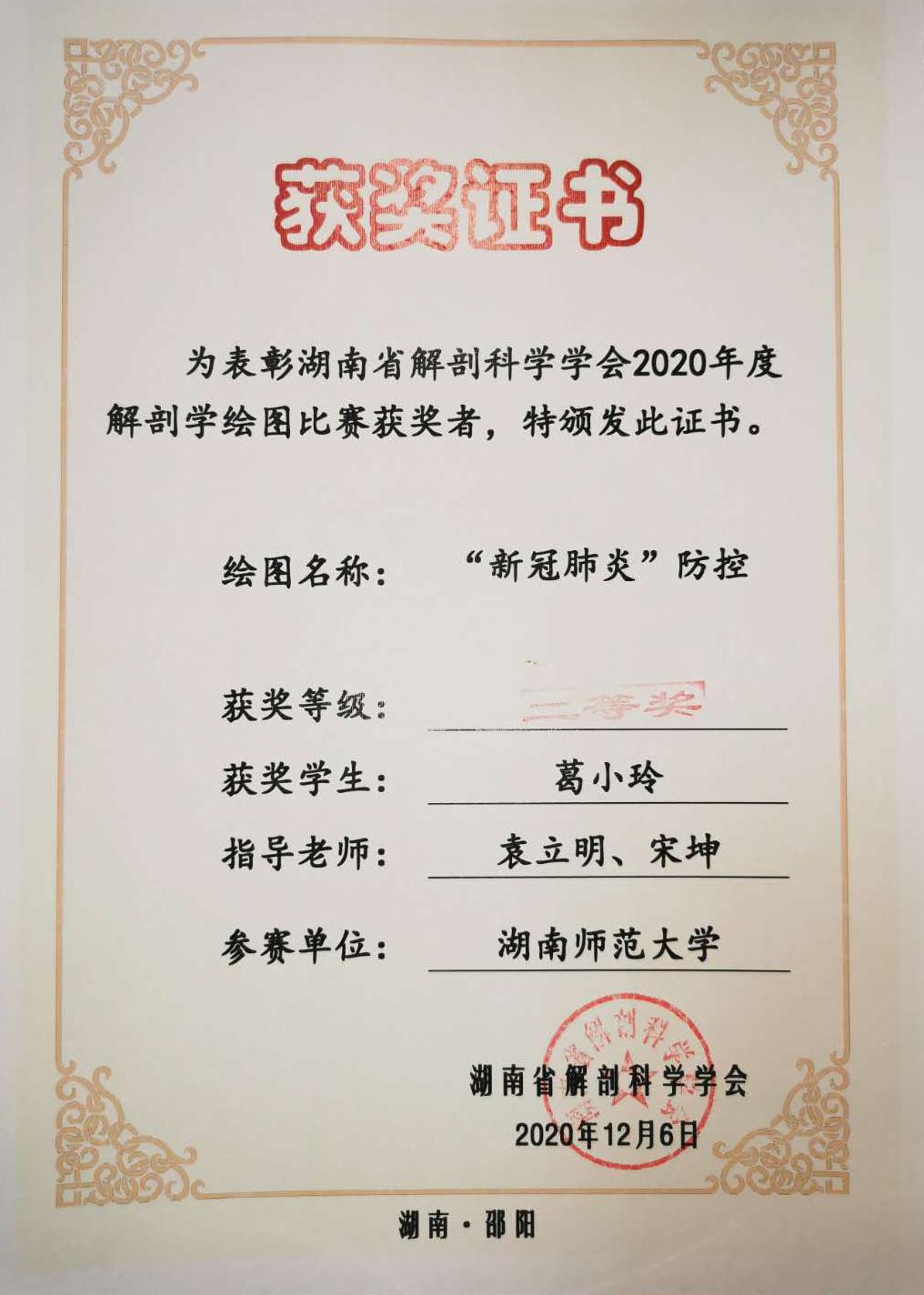 6日上午,解剖实践创新团队成员邢越、葛小玲参与2020年度学生论坛竞赛,均获得一等奖;汪坤,张焰,向伊羚参与标本制作比赛,分别获得二等奖、三等奖、三等奖;葛小玲、周倩参与解剖学绘图比赛,均获得二等奖。