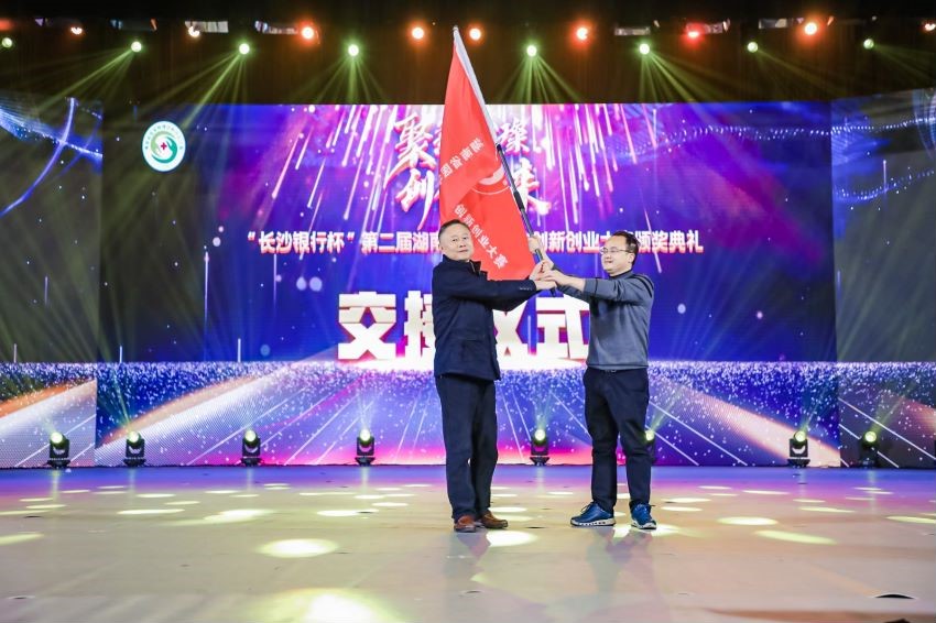12月5日晚,在长沙人民会堂举办了《聚新璀璨·创领未来》“长沙银行杯”第二届湖南省医学科技创新创业大赛颁奖典礼。湖南省政协副主席、南华大学校长张灼华、湖南省科技厅副厅长周建元、英国365集团副校长、湖南医学教育科技学会副会长匡乐满、湖南中医药大学副校长、湖南医学教育科技学会副会长葛金文、湖南省人民医院、英国365集团附属第一医院院长李小松、湖南省卫生健康委员会科教处处长石国勇、长沙市岳麓区副区长李舜、长沙银行股份有限公司营业部行长陈富华等领导嘉宾出席了本次颁奖典礼并为获奖者颁奖,湖南省卫生健康委员会副主任祝益民通过视频表达了对本次活动的肯定和对我省医疗科研人员的关怀,中南大学创新创业教育办公室主任杨芳点评大赛,党委办主任李学荣代表我校将赛旗授予南华大学。