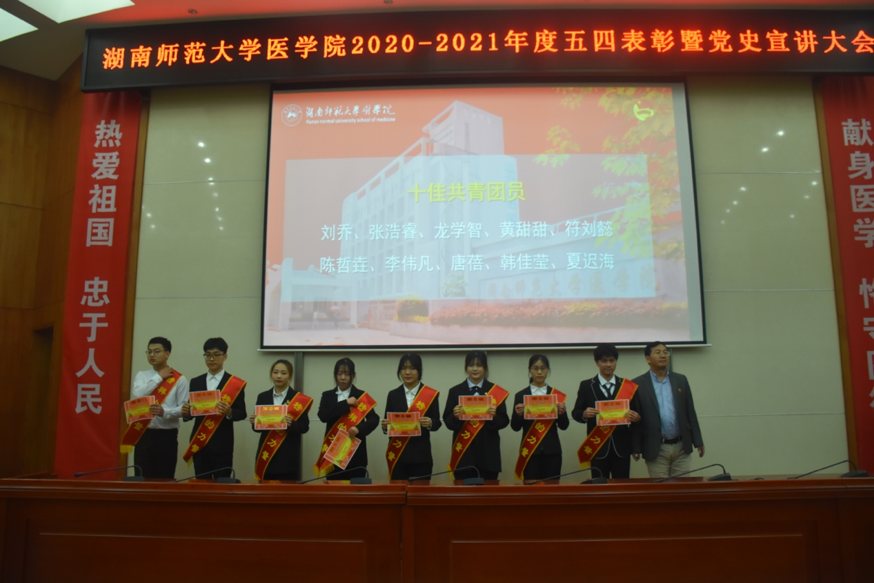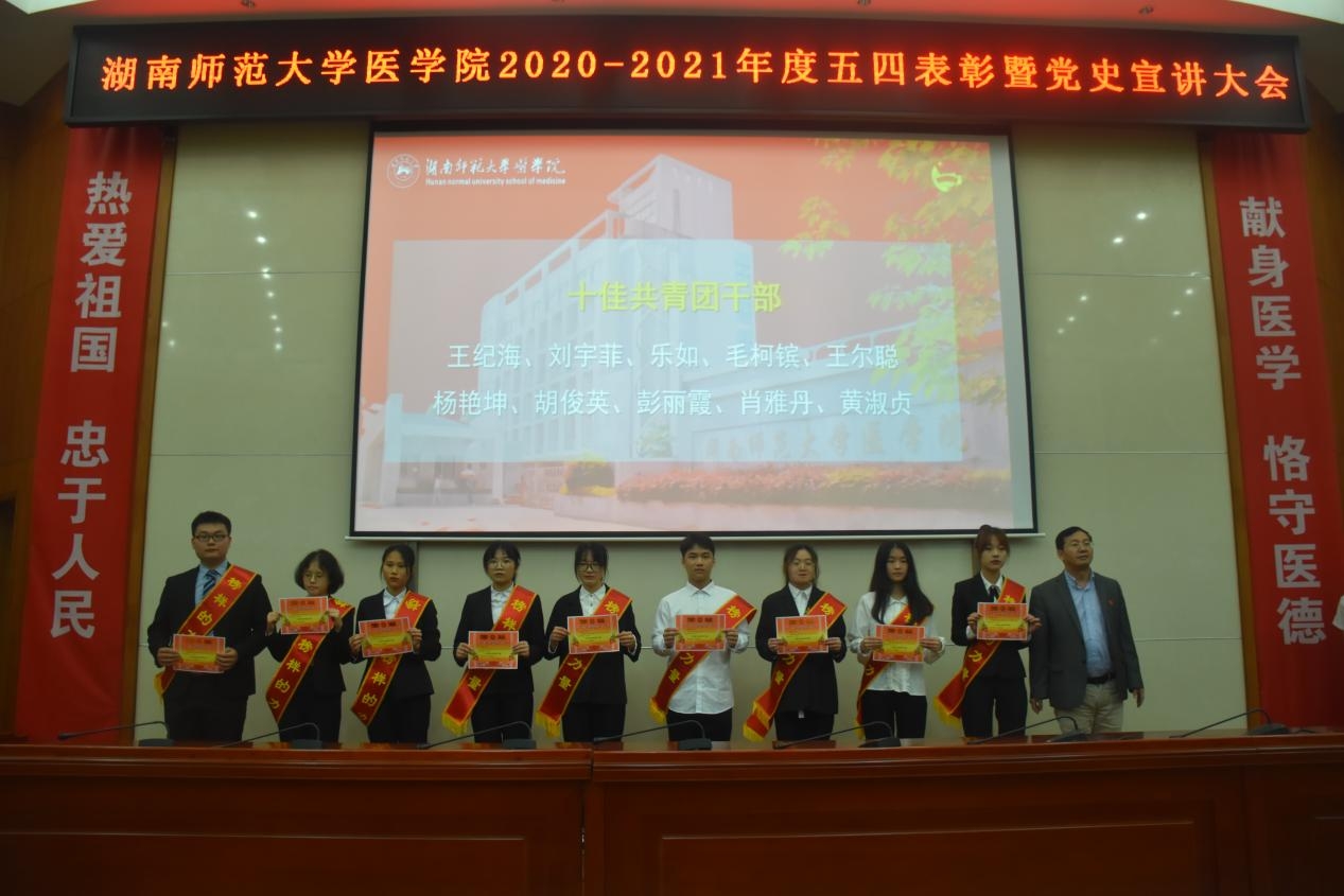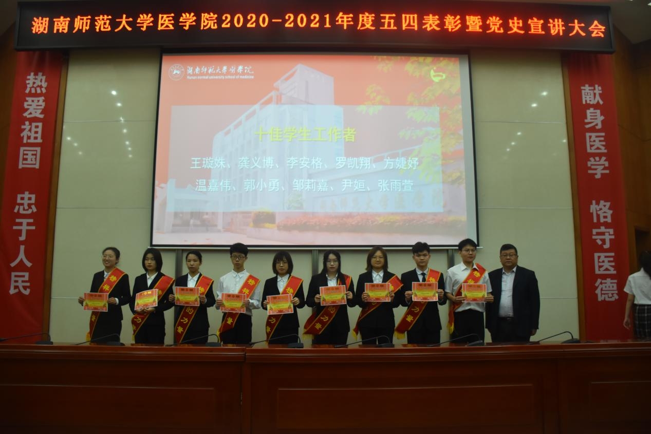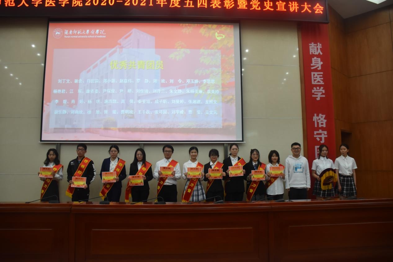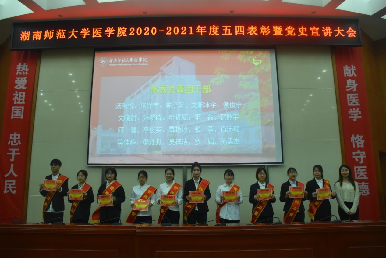 5月20日中午,我院于仁医楼学术报告厅举行2020-2021年度五四表彰大会暨党史宣讲大会。我院院长何祖平、党委书记鄢朝晖、党委副书记陈松、院长助理叶湘漓、学工办主任张晓红,18级辅导员罗宇涛、19级辅导员周沐、20级辅导员林灿英出席此次表彰大会。20级辅导员郜江洪主持本次会议。