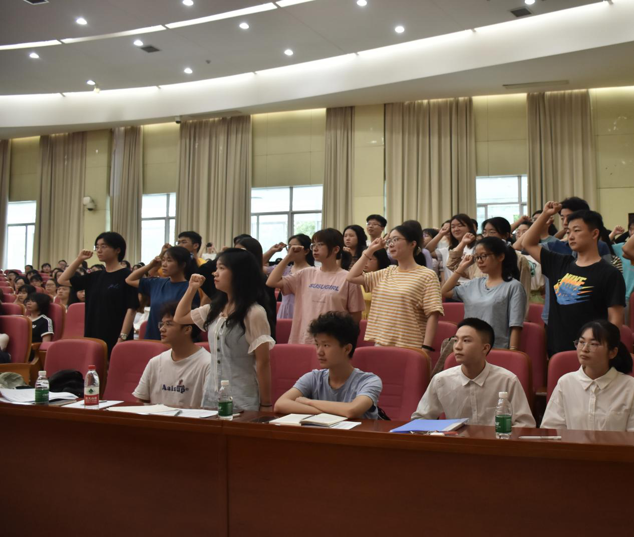 2017级党员代表沈立同志领誓,全体预备党员面对党旗,庄严宣誓,立志在日常学习、生活中起到模范带头作用。