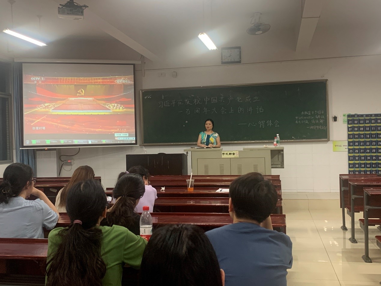 会上,支部书记阳美芳带领大家深入学习了习近平总书记在庆祝中国共产党成立一百周年大会上的讲话精神。她强调,广大研究生要认真学习领会习近平总书记“七一”重要讲话精神,从党的百年奋斗史中汲取前行力量,落实“学史明理、学史增信、学史崇德、学史力行”要求,进一步增强“四个意识”、坚定“四个自信”、做到“两个维护”。