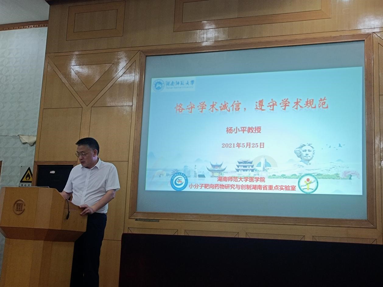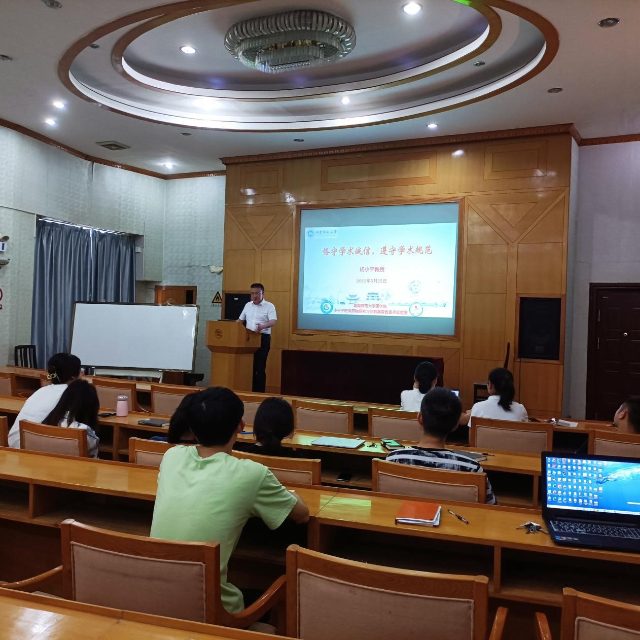 5月25日下午,我院小分子靶向药物研究与创制湖南省重点实验室举办了学术诚信与学术规范专题讲座。讲座由小分子靶向药物研究与创制湖南省重点实验室负责人杨小平教授主讲,重点实验室全体成员参加了此次讲座。