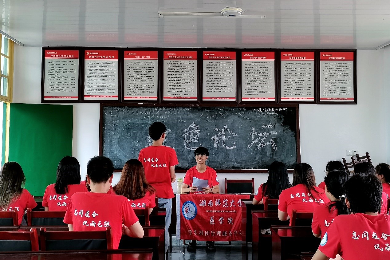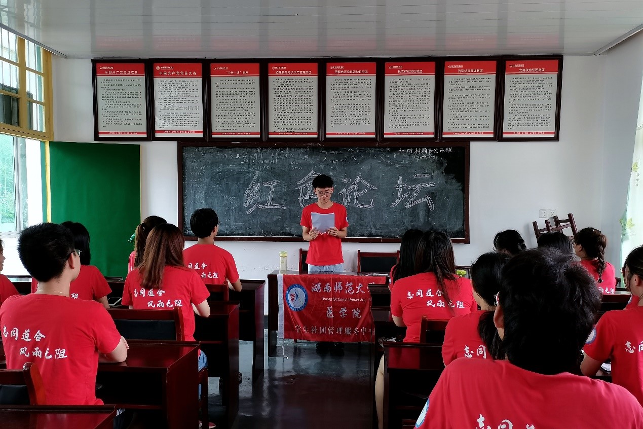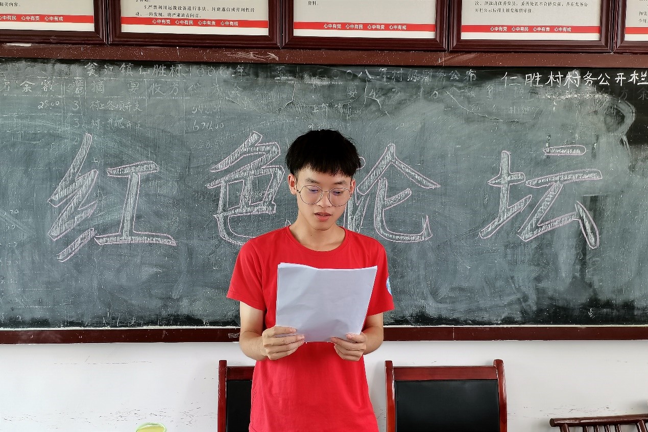 7月23日下午,我院学社管赴岳阳市平江县瓮江镇暑期社会实践团于瓮江镇仁胜村村委会议室举行“学习习近平系列讲话,深化理解习近平新时代中国特色社会主义思想”主题红色论坛。仁胜村村委书记吴如来、瓮江教育基金会秘书长刘碧霞、瓮江教育基金会副秘书长陈浩章、家长代表和志愿者代表全程参加此次活动。