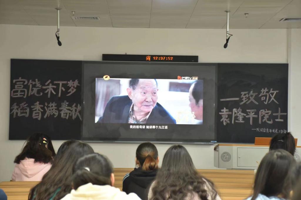 在主持人的宣布下,团课正式开始。本次团课以观看纪录片的形式带领大家穿梭时空,走进“当代神农”袁隆平宏阔瑰丽的一生,视频讲述袁隆平院士的生平事迹和他对杂交水稻研究的坚守。为了心中的杂交水稻覆盖全球梦和禾下乘凉梦能够实现,他耗尽一生不断奋斗着,把对祖国的热爱结成饱满的稻穗。在视频的末尾,袁院士对青年人表达了自己的期望:“我始终都还在努力使梦想成真,你们是新时代中国青年,我相信你们必定会在追求真理的道路上躬行实践、厚积薄发并将不会辜负时代的担当”。视频播放完毕后,主持人上台进行总结并宣布团课结束。