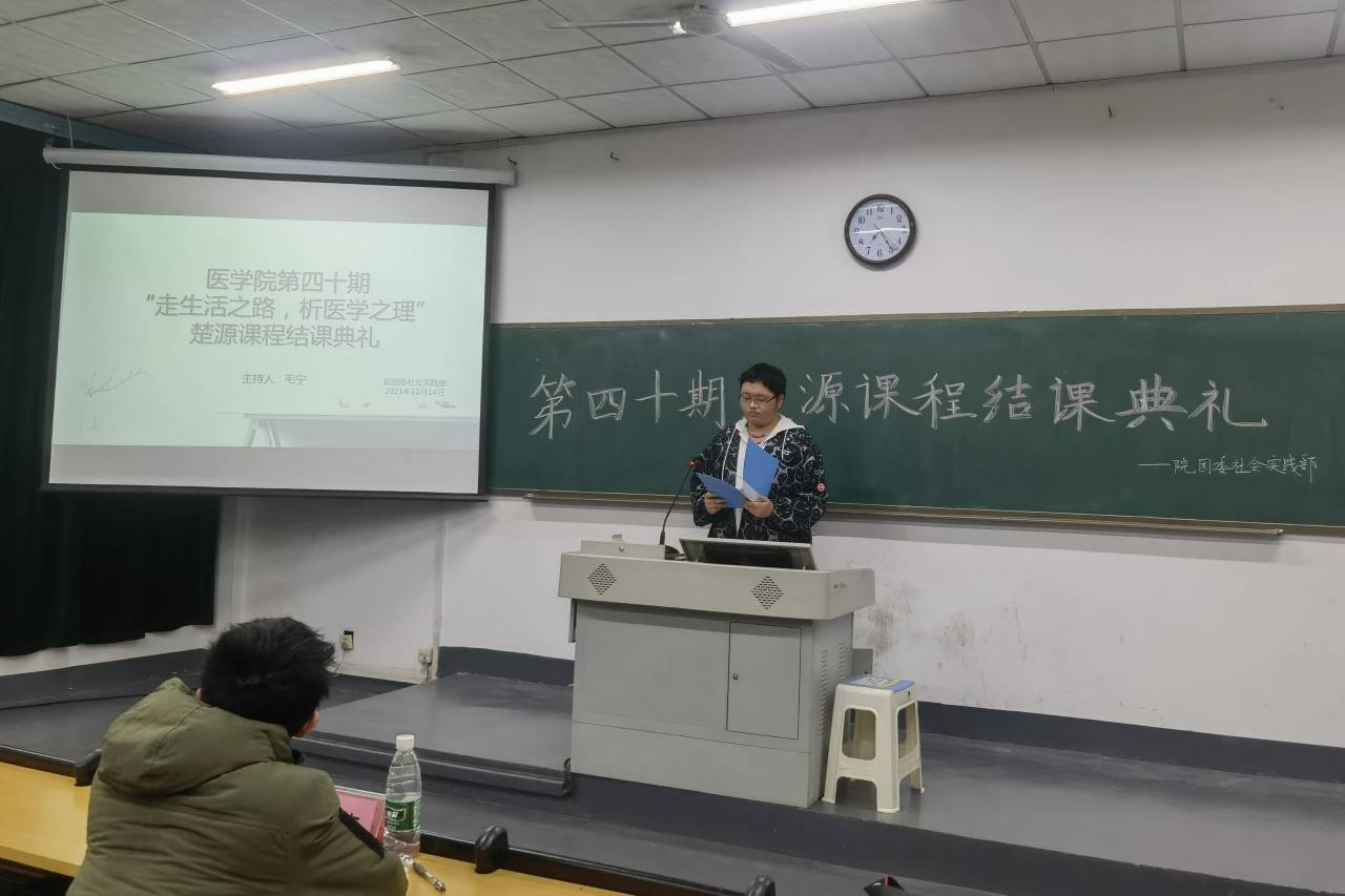12月14日晚,我院团委社会实践部于勤医楼四教室举行第四十期楚源课程结课典礼。院团委学生副书记童海以及楚源课程负责人和学员参加此次活动。