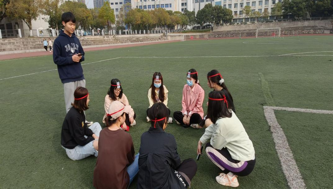 在蒙眼躲障碍接力游戏中,四位同学组成一队。一位同学被主持人用布蒙住眼睛,由另一位同学指引路。以50米为接力比赛路程,从起点到终点分为3个接力站,四位同学依次为他人指路并躲过障碍,以哪一队最先到达终点站为胜。各组同学团结一心,友谊比赛,圆满结束了此次活动。
