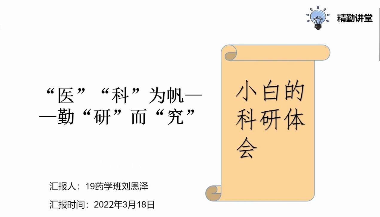 3月18日晚上,我院团委青年创新创业指导中心在腾讯会议线上开展“握科技小秘笈,书时代新征程”主题精勤讲堂。此次讲座由21级临床一班雷灵林主持,邀请到19级药学班刘恩泽主讲,我院部分本科生参加此次讲座。