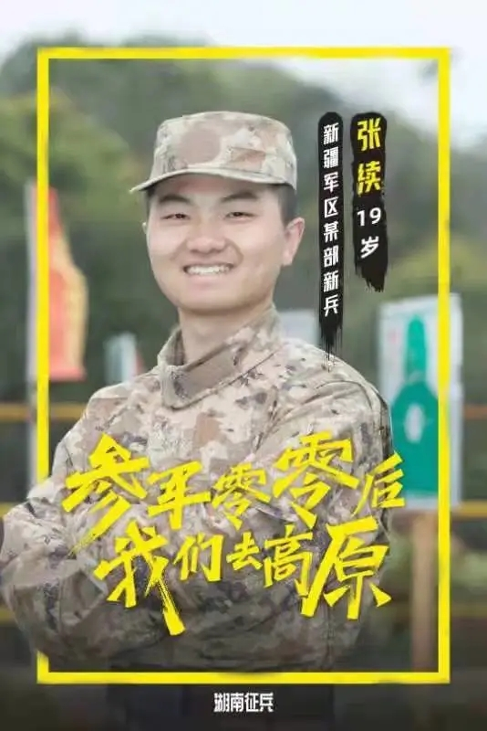 张续,从小在军旅剧的熏陶感染之下,怀揣着入伍当兵的人生理想,毅然抛下十年寒窗苦读拼来的美好大学生活,前往三千多公里外的新疆高原,戍守保卫祖国河山。他经历了高考志愿三所军医大学落榜、21年递交申请却因身体不适再次错过入伍,但他一直坚守初心,永不言弃。这次能够去到艰苦地区为祖国做奉献,他感到无比自豪和荣幸。