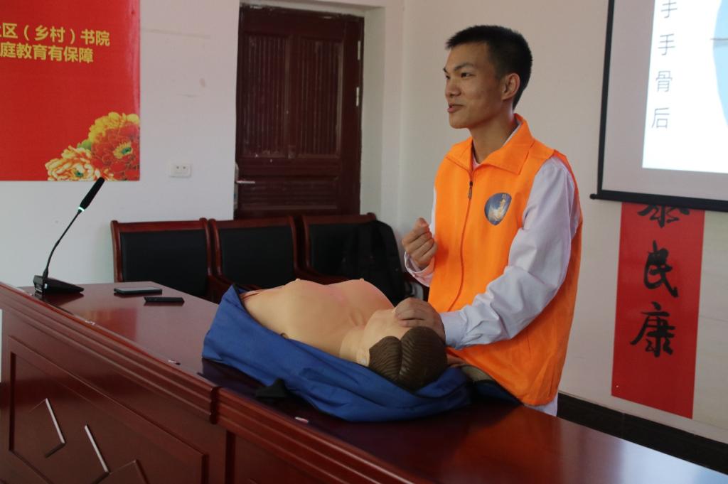 会议伊始,团队成员们提前赶到宣讲场地,布置好所需仪器设备,并为前来听讲的村民安排好座位。此次健康知识宣讲以“心肺脑复苏”为主题,文圣杰简单普及了心肺脑复苏的概念及其挽救生命的重大意义。他介绍了数个因心搏骤停而死亡的典型病例,通过实例向村民们强调了非医务人员专业知识缺乏是成功心肺脑复苏的障碍之一。随后,他重点讲解了心肺脑复苏的救治流程,用专业知识传授村民如何评估环境、判断意识、呼叫求助、病情识别、胸外按压、开放气道、人工呼吸、反复压吹、判断效果等一系列救治步骤。他也通过对人体模型的实际操作生动形象地展示了胸廓外部按压方法和注意要点。同时,他表示在现实生活中大多数人属于协助救援者,所以紧接着教授了心肺脑复苏过程中协救者的几大任务,如确保环境安全、及时拨打120、拿AED等。最后,他向村民们强调不能对正常人实施心肺脑复苏救治,否则会适得其反甚至造成事故。
